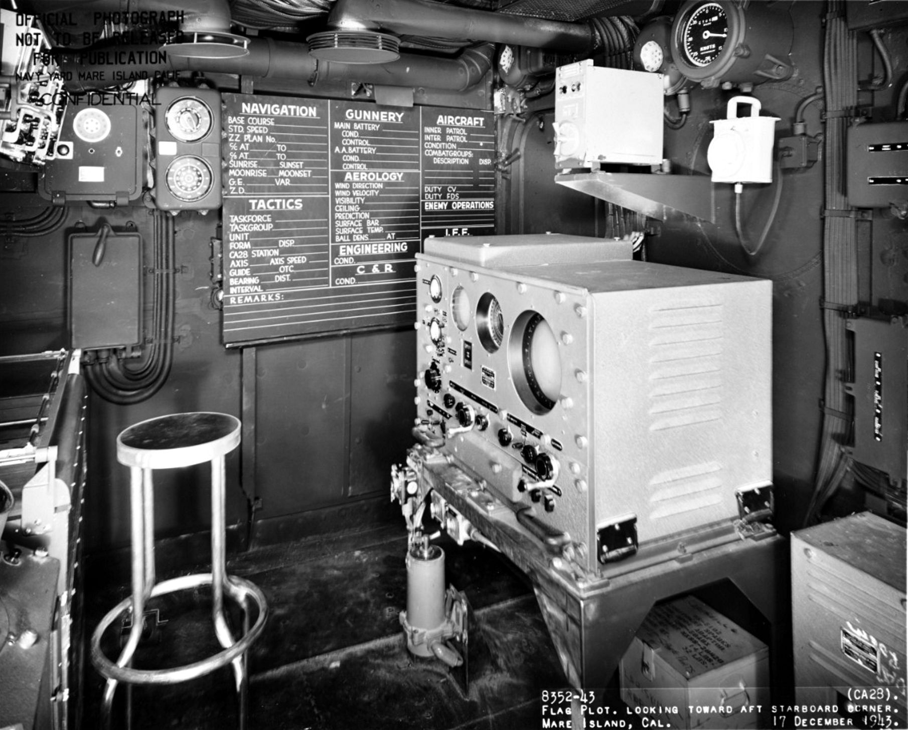 View in flag plot, taken at Mare Island Navy Yard, Mare Island, California,17 December 1943. Naval History and Heritage Command photo #NH 92377. |