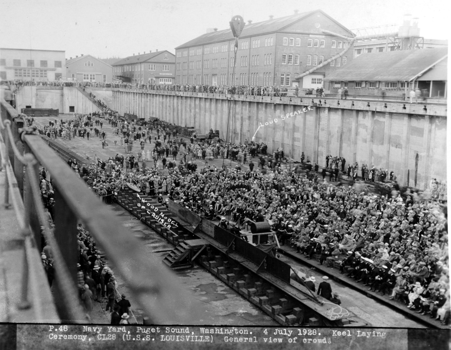 Keel laying ceremony at the Puget Sound Navy Yard, 4 July 1928. Note: seated crowd, loud speaker, and wooden model of cruiser. Naval History and Heritage Command, Photo #NH 70480. |