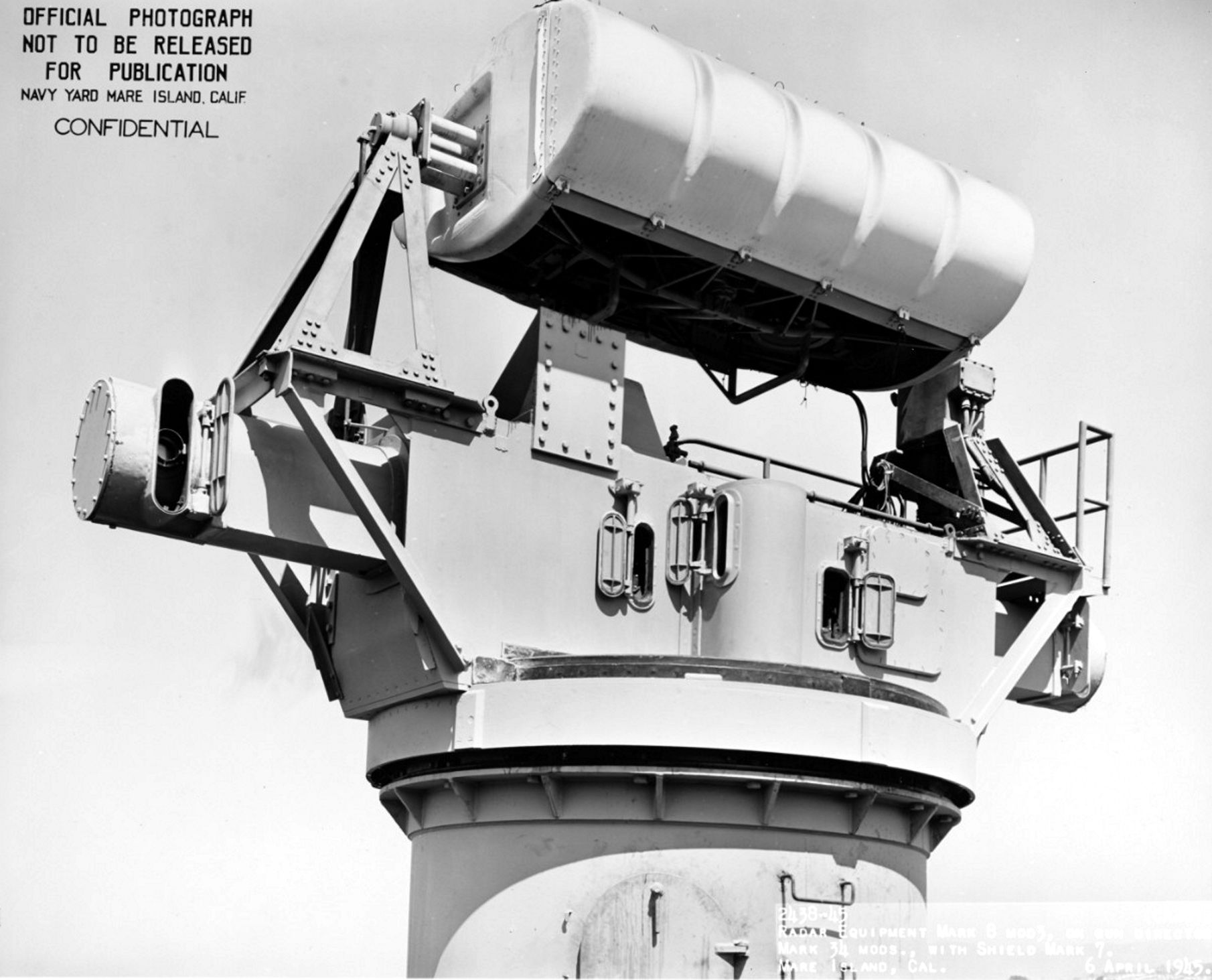 MK 34 gun director, with MK 8 MOD 3 Radar, and Shield MK 7 onboard USS Louisville (CA 28), at Mare Island Navy Yard, Mare Island, California, 6 April 1945. Naval History and Heritage Command photo #NH 92370. |