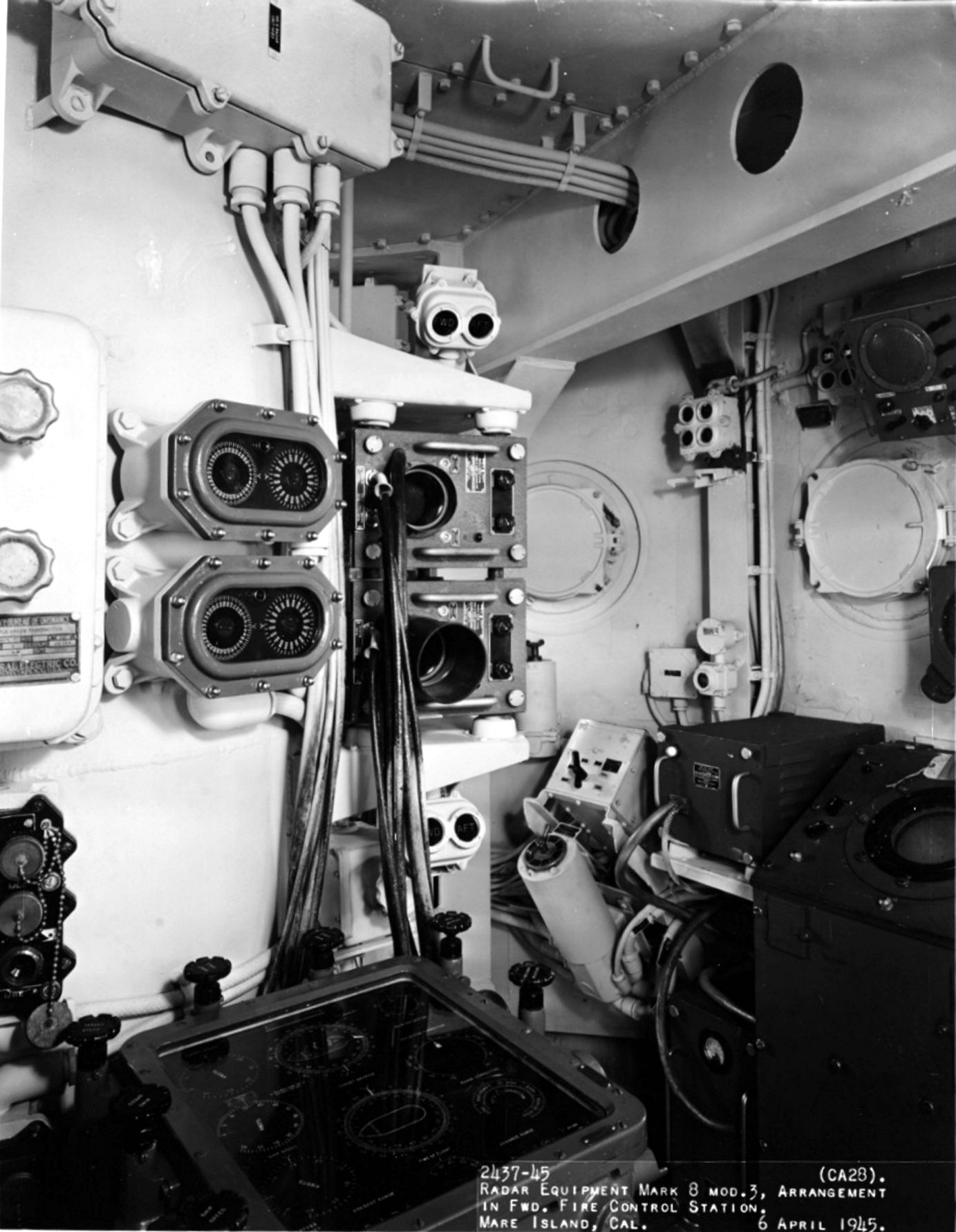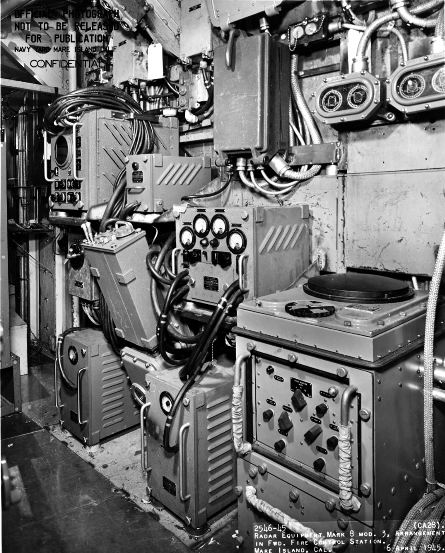Radar equipment MK 8, MOD 3 (main battery control) in the foreword fire control station of USS Louisville (CA 28), at Mare Island Navy Yard, Mare Island, California, 6 April 1945. Naval History and Heritage Command photo #NH 92373. |