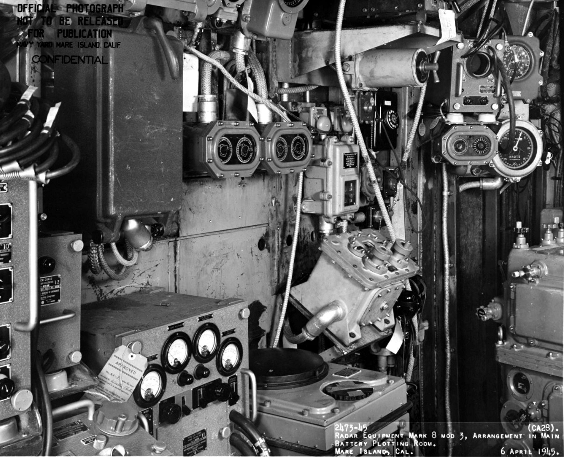 Radar equipment MK 8, MOD 3 (main battery control) in the main battery plotting room of USS Louisville (CA 28), at Mare Island Navy Yard, Mare Island, California, 6 April 1945. Note manufacturers' approval tag on console in lower left. Naval History and Heritage Command photo #NH 92374. |