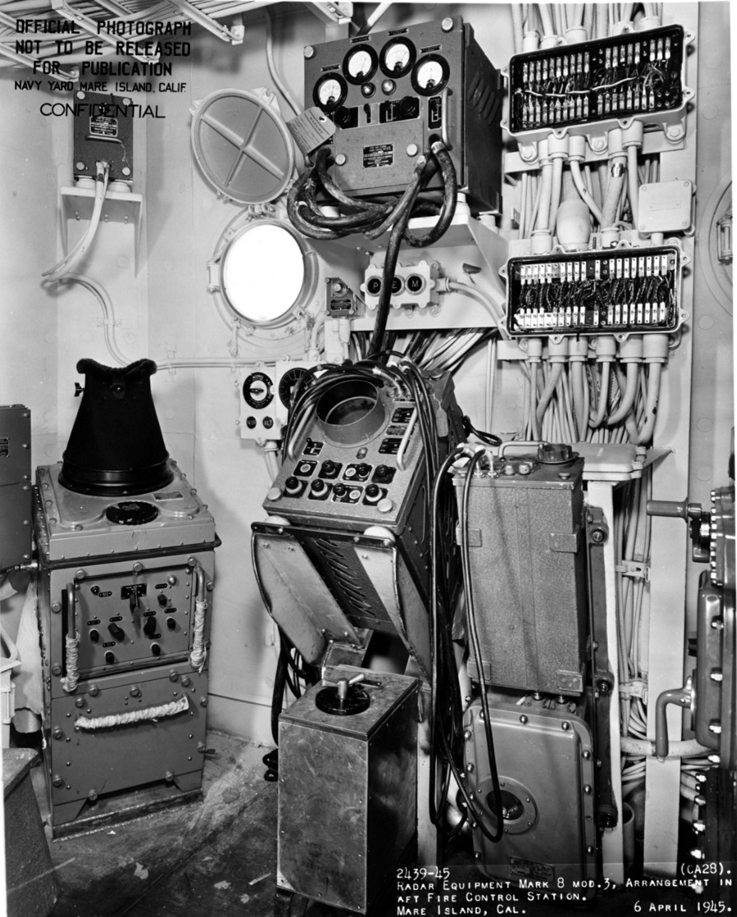 Radar equipment MK 8, MOD 3 (main battery control) in the aft fire control station of USS Louisville (CA 28), at Mare Island Navy Yard, Mare Island, California, 6 April 1945. Naval History and Heritage Command photo #NH 92372. |