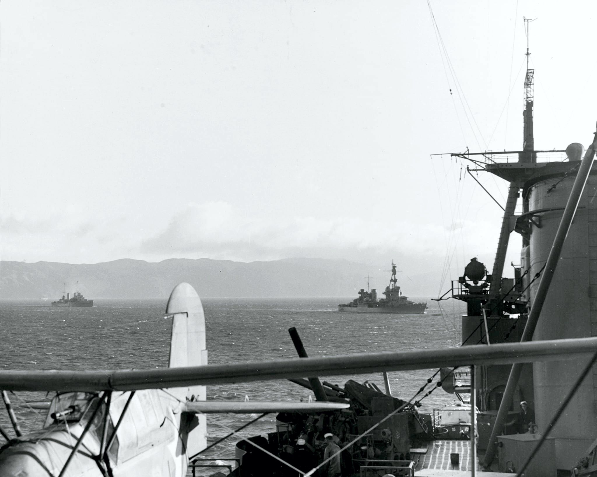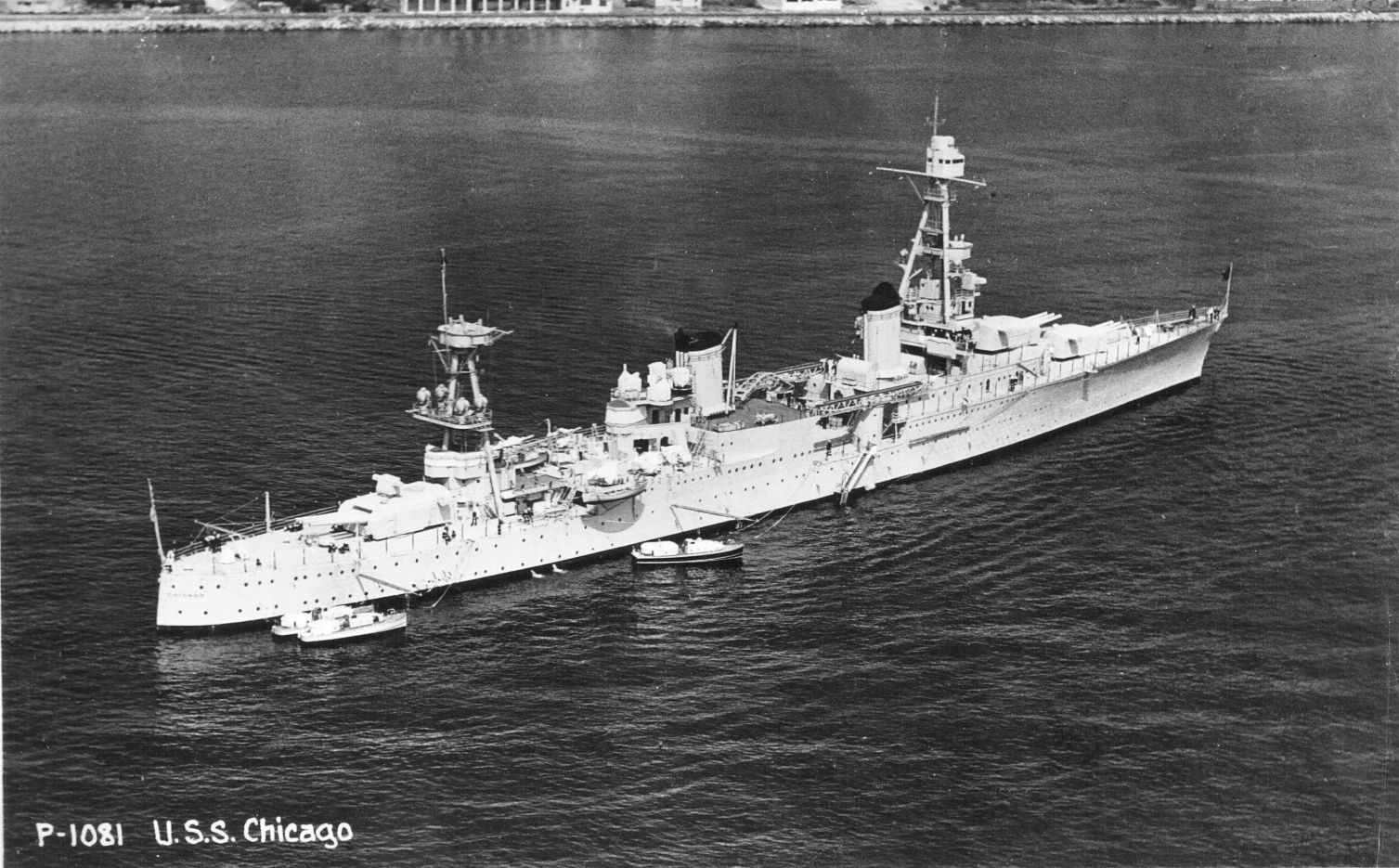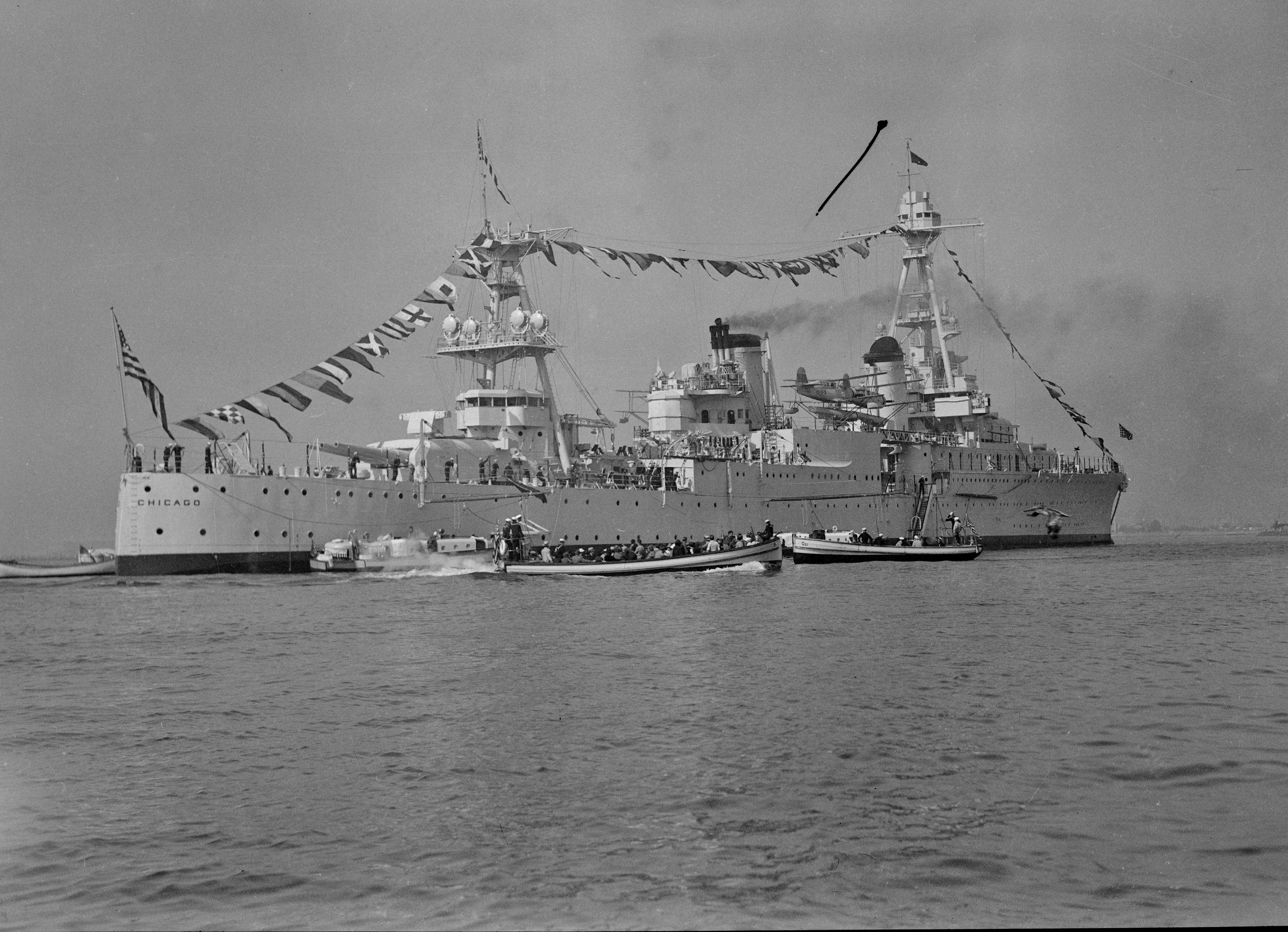 100k | Two days before the Pearl Harbor attack, a carrier-cruiser group built around USS Lexington (CV 2) departed Pearl Harbor to deliver reinforcement aircraft to Midway. This is USS Chicago (CA 29) underway as seen from USS Portland (CA 33). She operated with TF12 from 5 to 13 Dec 1941. |