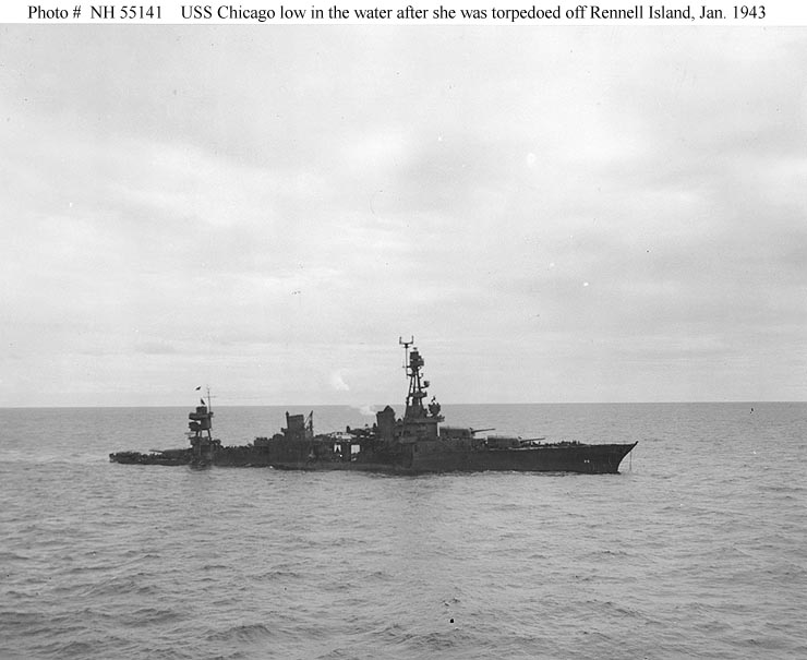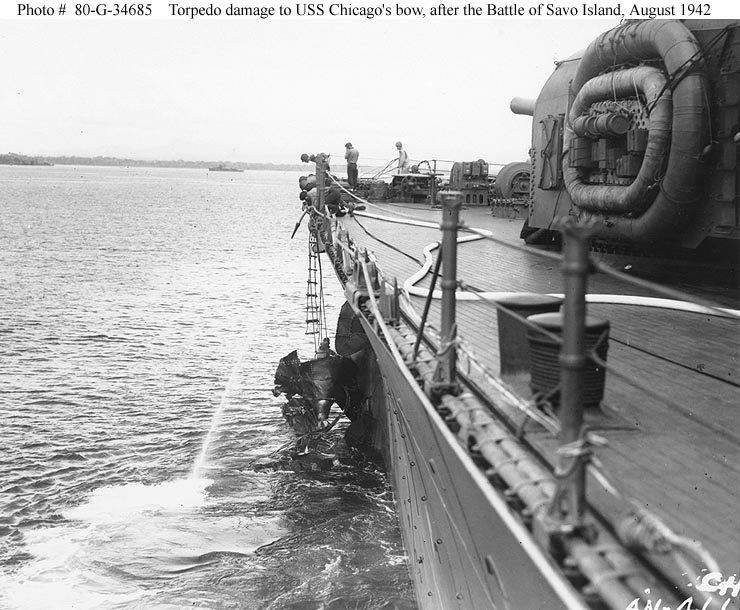 620k | USS Chicago (CA 29), damage by a Japanese torpedo hit which did not explode. This occurred during 9 August 1942 during an attack off Tulagi, Solomon Islands. Port side view. NARA II photo #80-G-66501: |