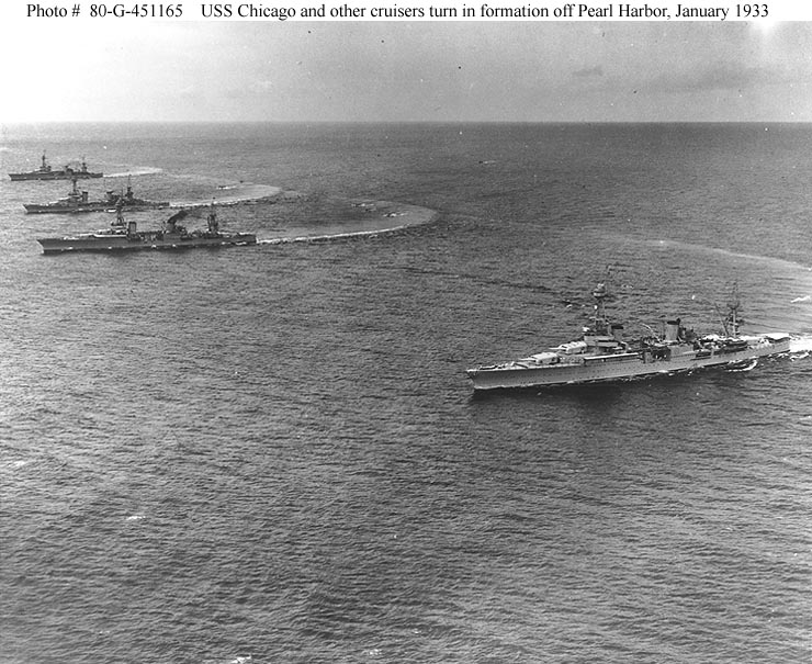 149k | Two days before the Pearl Harbor attack, a carrier-cruiser group built around USS Lexington (CV 2) departed Pearl Harbor to deliver reinforcement aircraft to Midway. This is USS Chicago (CA 29) underway as seen from USS Portland (CA 33). She operated with TF12 from 5 to 13 Dec 1941. | John Chiquoine |