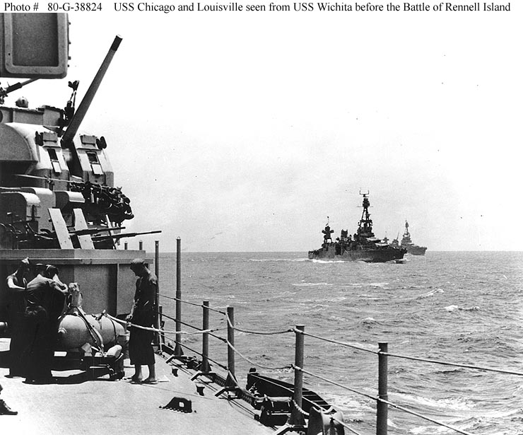 Battle of Rennell Island, 29-30 January 1943 - Cruisers of Task Force 18 at sea en route to Guadalcanal on 29 January 1943, prior to the Japanese night air attack off Rennell Island. Photographed from USS Wichita (CA 45). USS Chicago (CA 29) is in the right center, with USS Louisville (CA 28) in the distance. Note men on Wichita's deck, working on a paravane. Official U.S. Navy Photograph, now in the collections of the National Archives. |