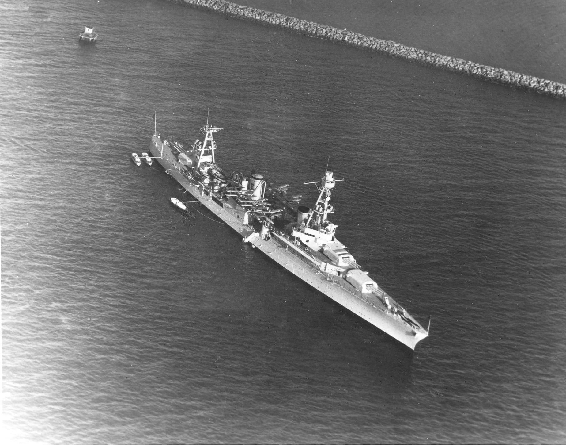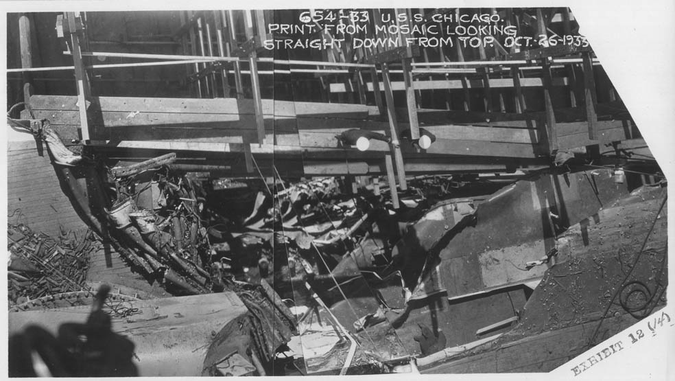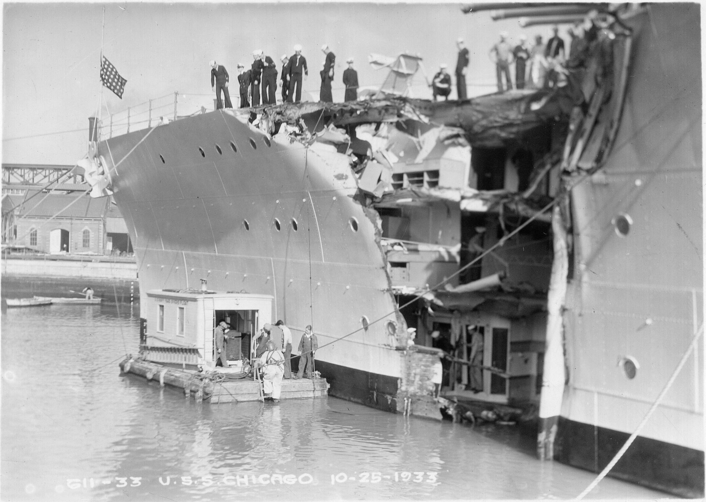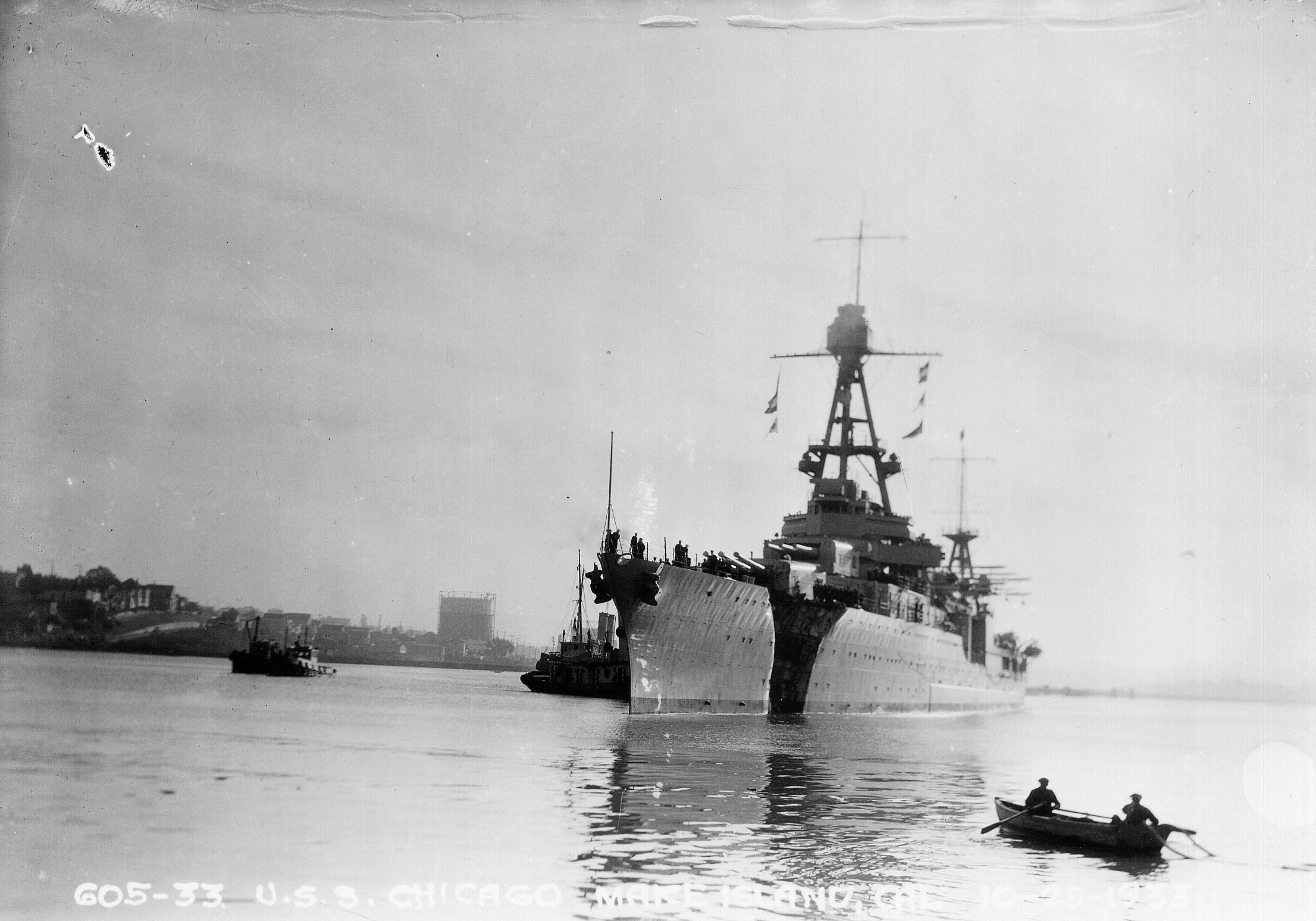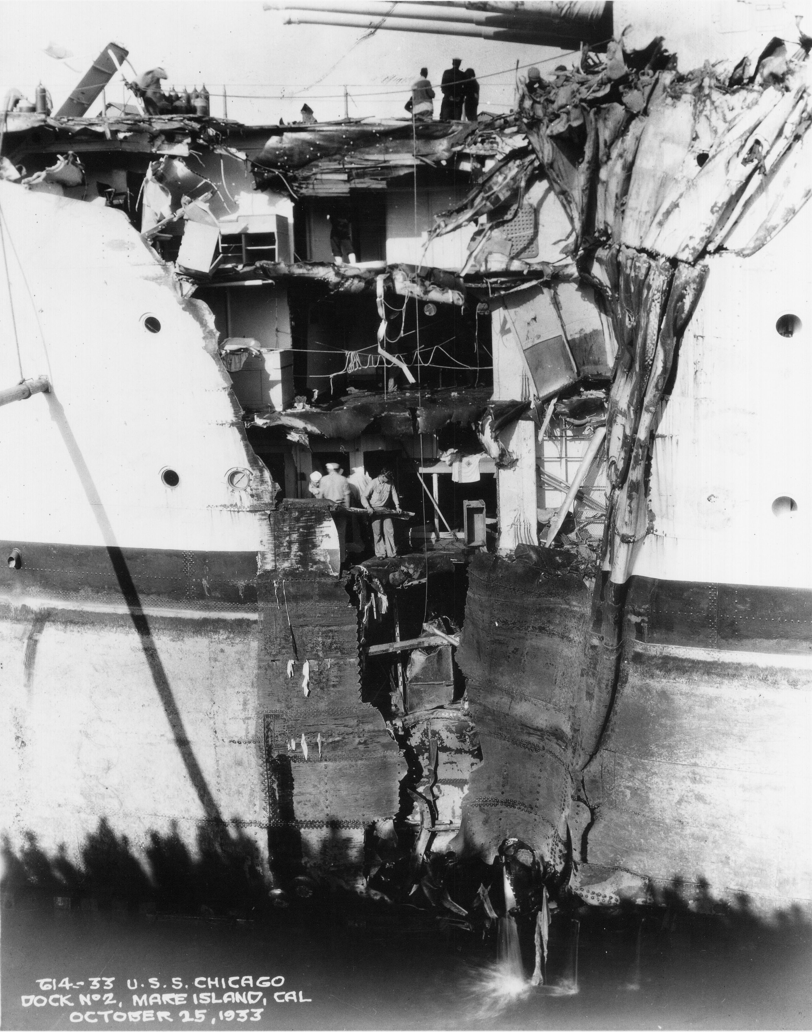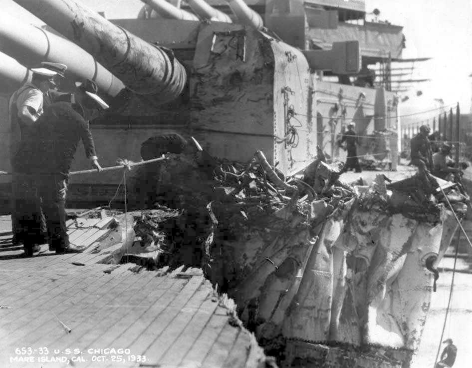 288k | The damaged USS Chicago (CA 29) is entering Mare Island Navy Yard on 25 Oct 1933 after her collision with the British freighter Silver Palm. The collision killed 3 officers. | Robert M. Cieri |