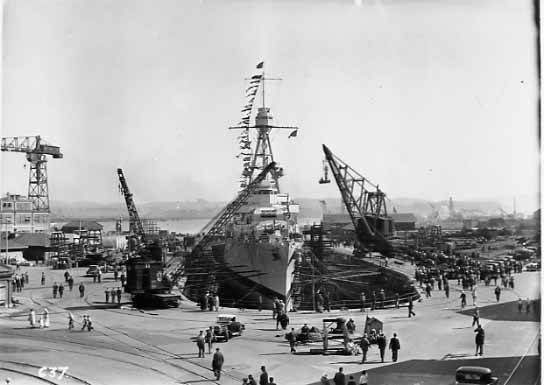 Drydocked in Sydney showing temporary repairs made to the bow prior to departing for Mare Island. National Archives, San Francisco Branch, Mare Island Naval Shipyard General Correspondence files, 1941-47 |