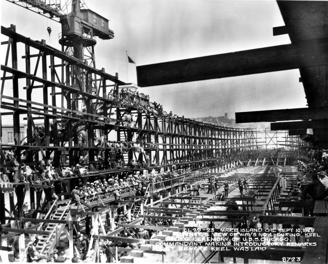 The general view of the keel laying of the USS Chicago (CL 29) at Mare Island Navy Yard on 10 September 1928. U.S. Navy photo. |
