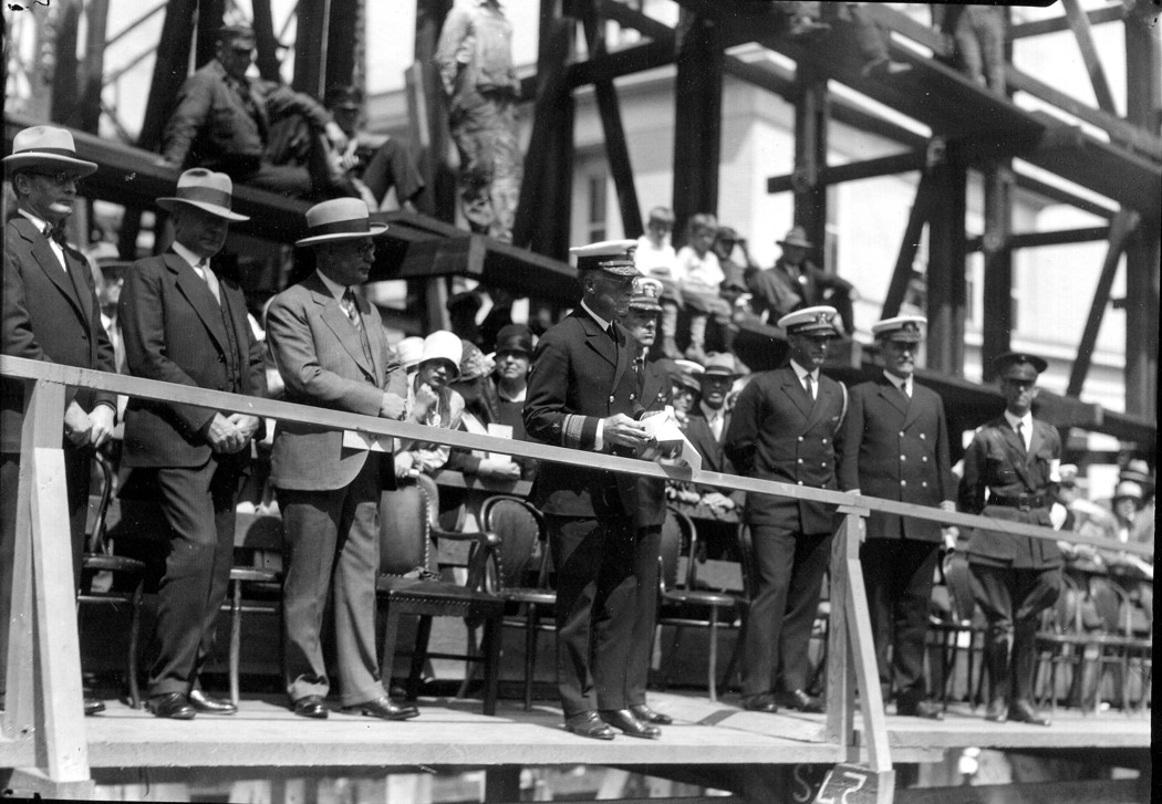 RADM G. W. Laws, Shipyard Commandant, address the crowd at keel laying of the USS Chicago (CL 29) at Mare Island Navy Yard on 10 September 1928. U.S. Navy photo. |
