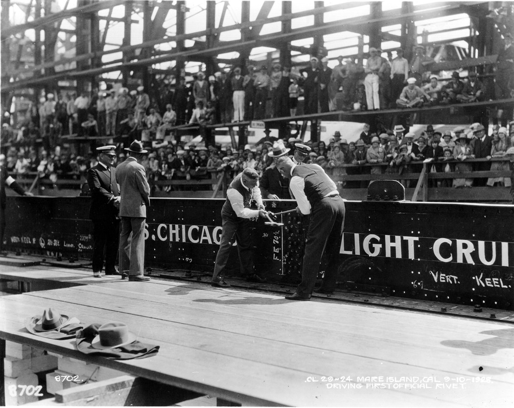 Mayor Heegler, Vallejo, and Collie Fitzgerald drive the first rivets into the keel of the USS Chicago (CL 29) at Mare Island Navy Yard on 10 September 1928. U.S. Navy photo. |
