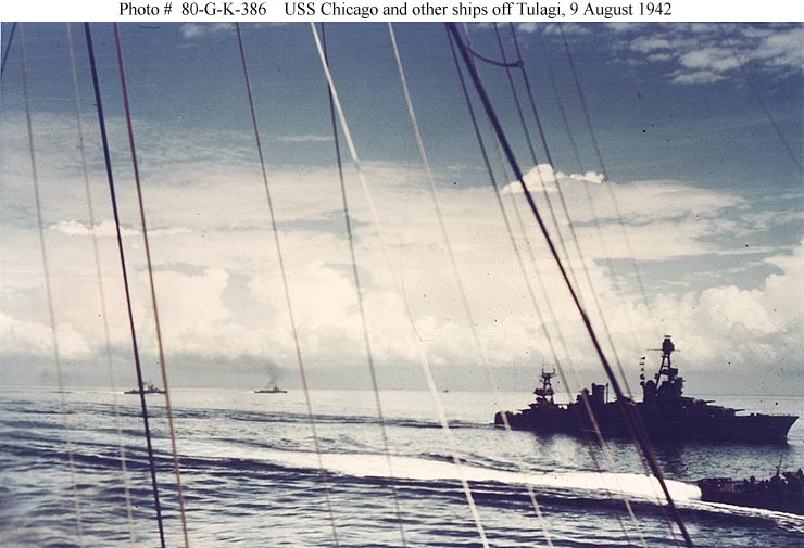 Battle of Savo Island, 9 August 1942 - USS Chicago (CA 29) off Guadalcanal the day after the action, showing crewmen cutting away damaged plating to enable the ship to get underway. She had been torpedoed at her extreme bow during the night action of 9 August 1942. View looks forward along her port side, with # 1 eight-inch gun turret in the upper right. Note life rafts hung on the turret side and destroyers in the distance. Official U.S. Navy Photograph, now in the collections of the National Archives #80-G-34685. |