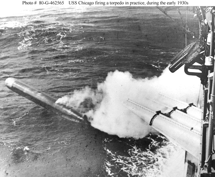 94k | USS Chicago (CA 29) Firing a torpedo in practice,