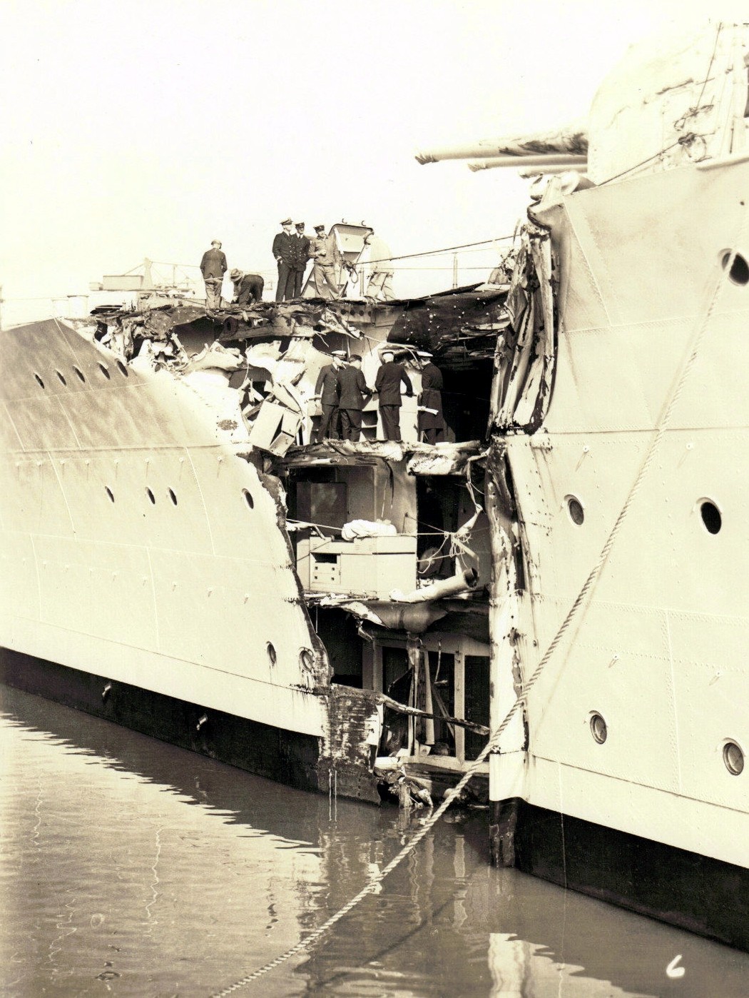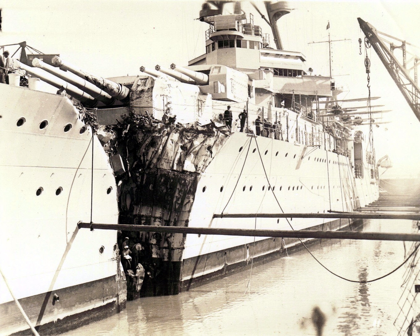 last overhaul, including the repair of her torpedo-damaged bow. Note railway