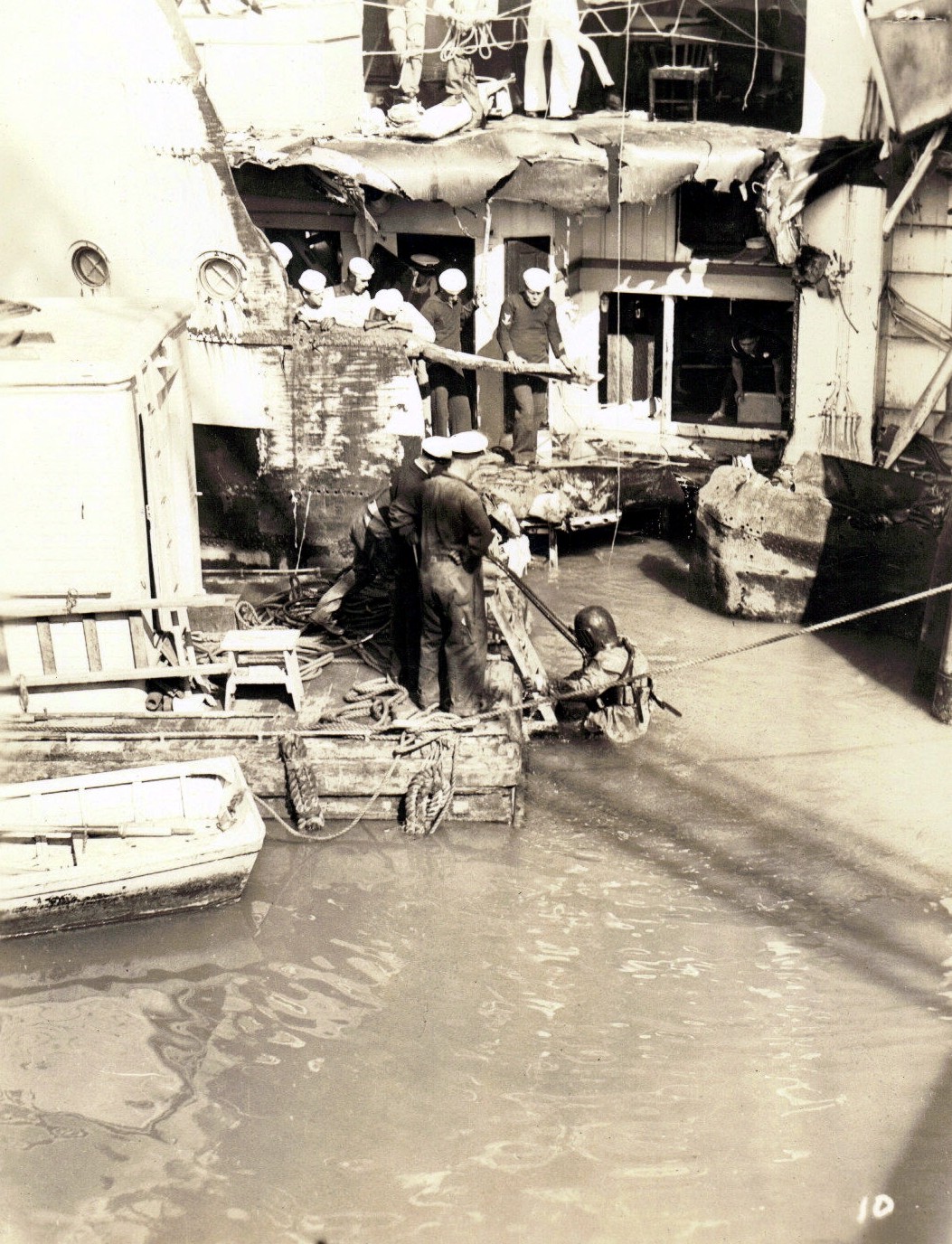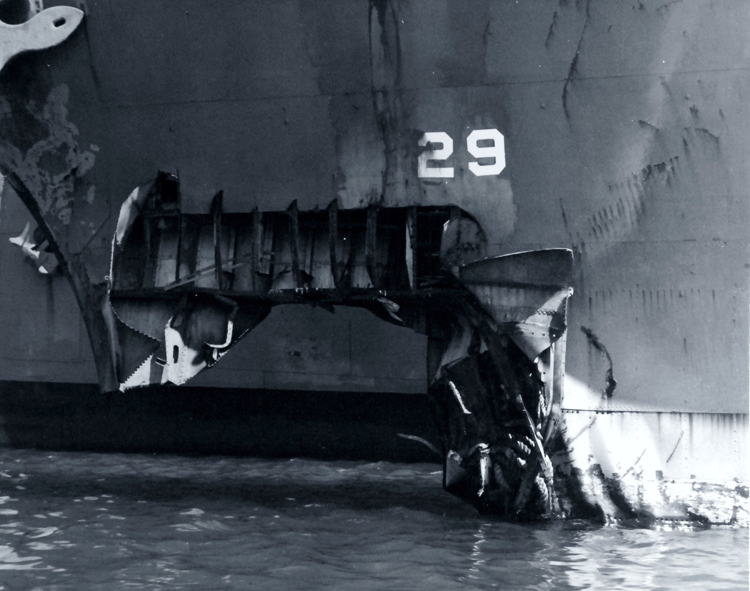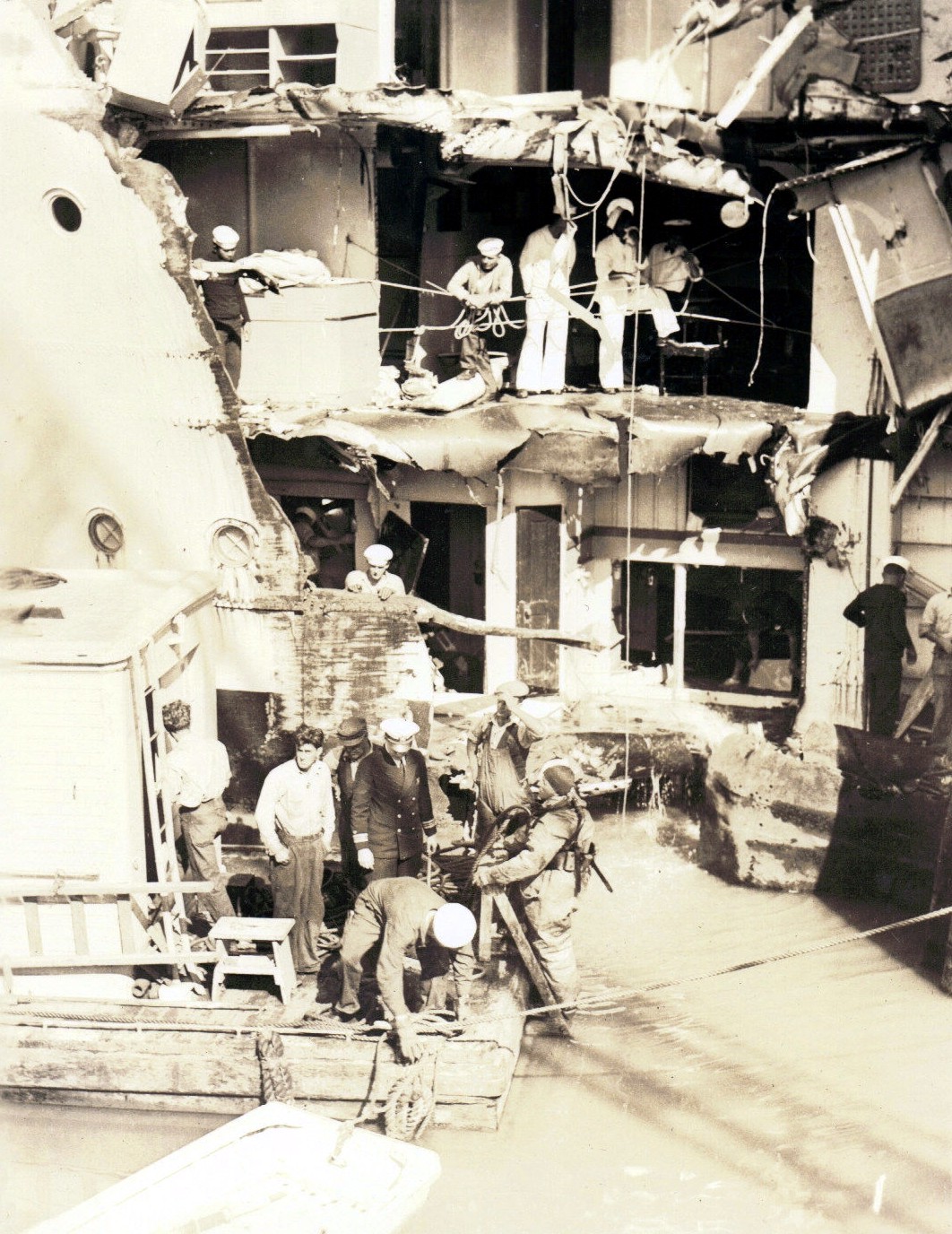 Photo Caption: "Showing general effect of the explosion in deflecting the structure to port." This photo was taken while in drydock in Sydney, Australia prior to temporary repairs. National Archives, San Francisco Branch, Mare Island Naval Shipyard General Correspondence files, 1941-47 |