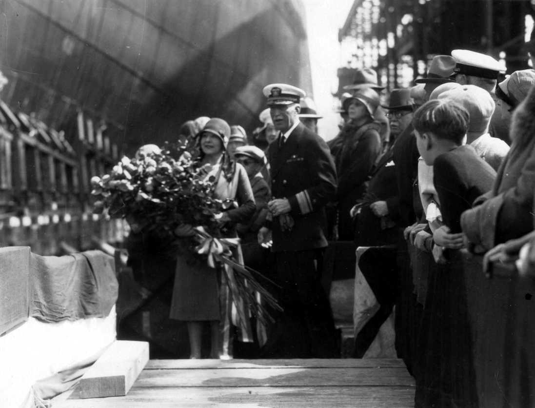 Miss E. Britten (Chicago's Sponsor) with RADM G. W. Laws (Commandant, Mare Island Navy Yard) are seen about to christen USS Chicago (CL 29) at Mare Island on April 10, 1930. Photo is courtesy of the Vallejo Naval and Historical Museum. |