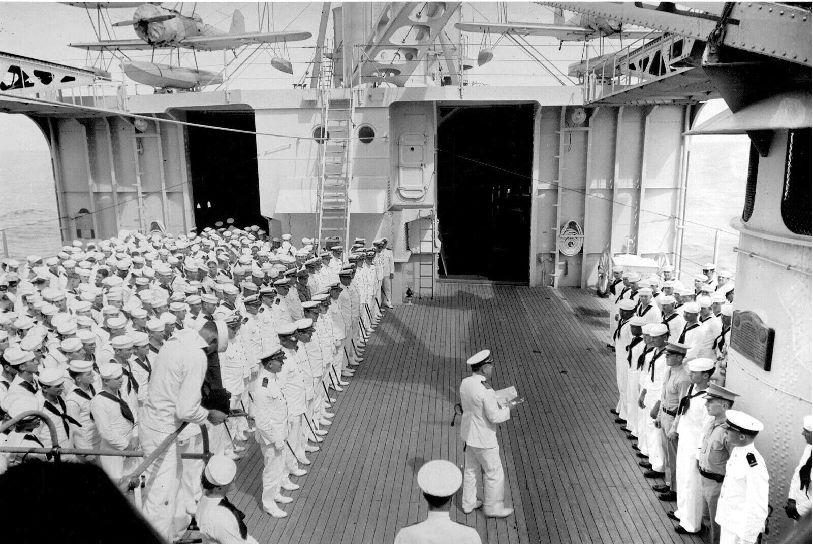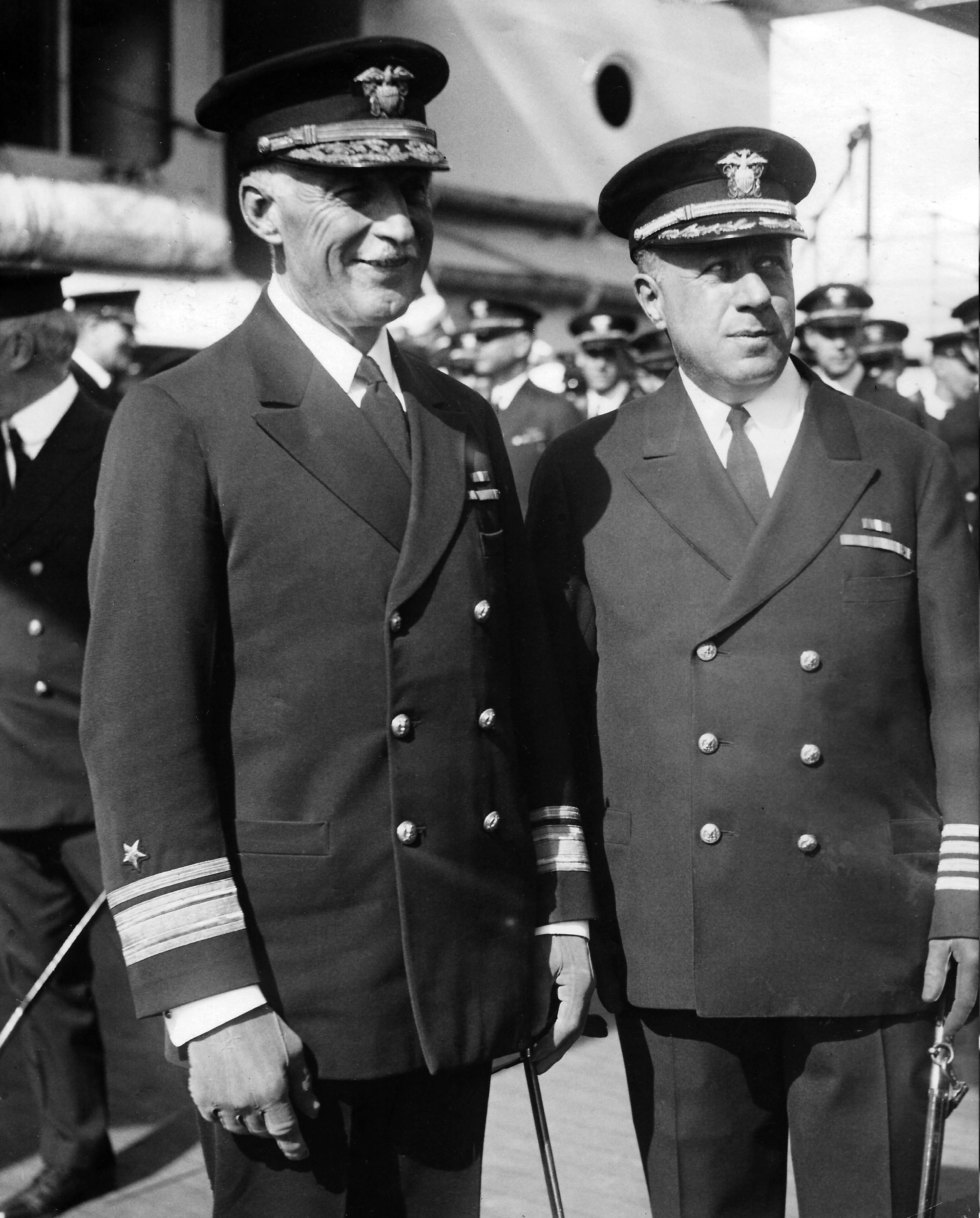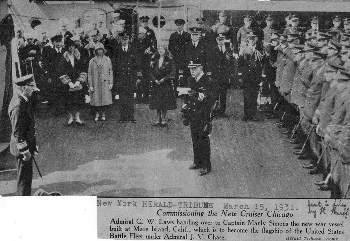 1m | Mare Island Navy Yard (9 March 1931) – Captain Manley Hale Simons, the first commanding officer of the super cruiser USS Chicago and Rear Admiral George William Laws, commandant of the Mare Island Navy Yard, join together in attending the commissioning ceremony. Photo courtesy of the Acme Newspictures. |