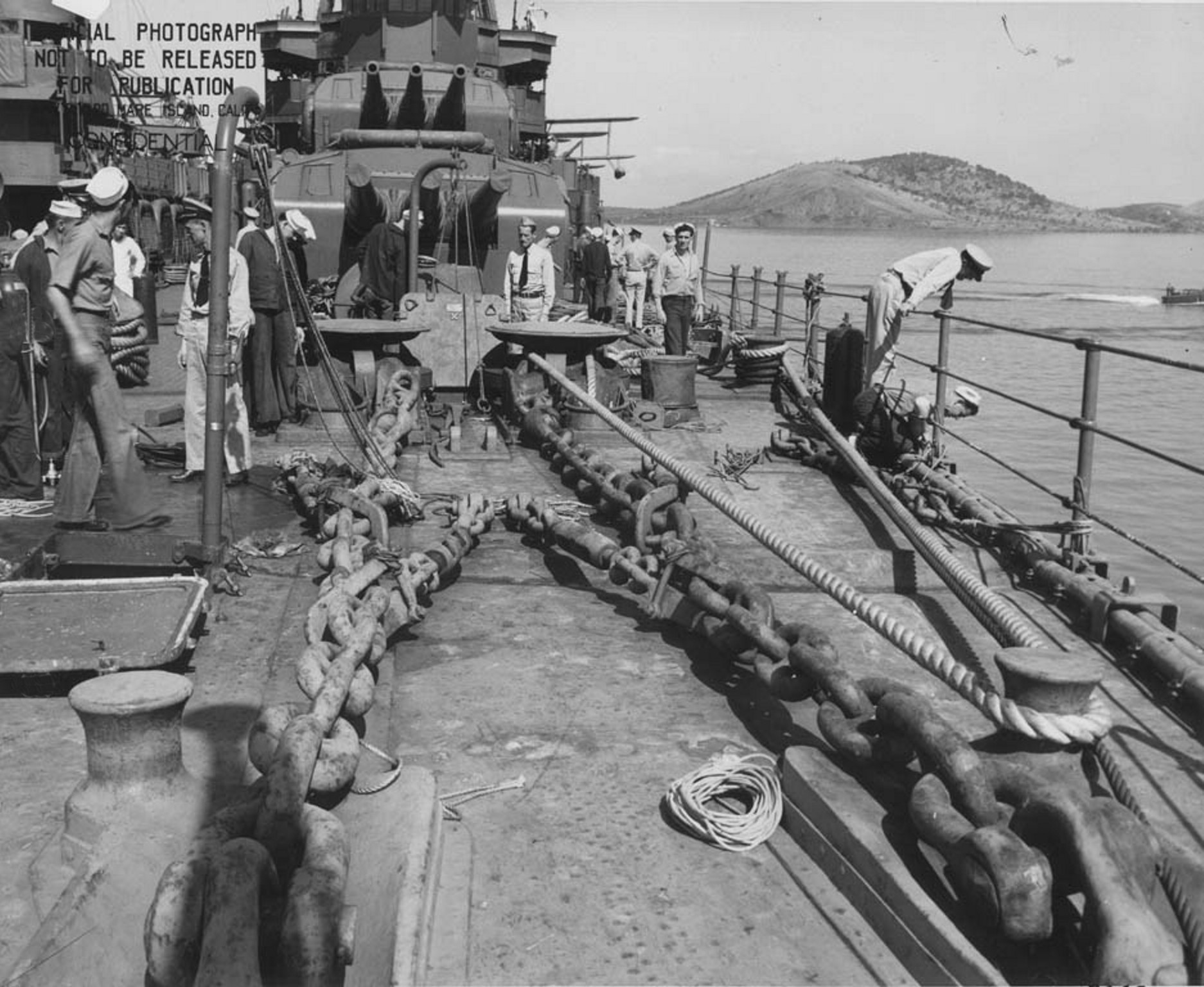 Photo taken by members of VCS-4; Chicago's scout plane squadron dated 8-15-1942, probably at Noumea. Note ripples in deck under anchor chain. National Archives, San Francisco Branch, Mare Island Naval Shipyard General Correspondence files, 1941-47 |