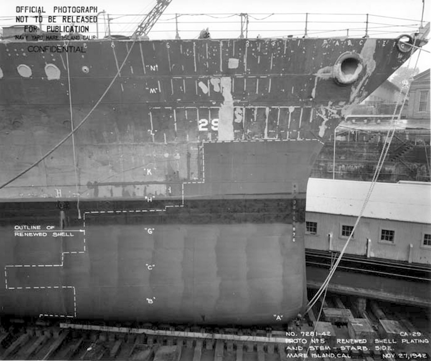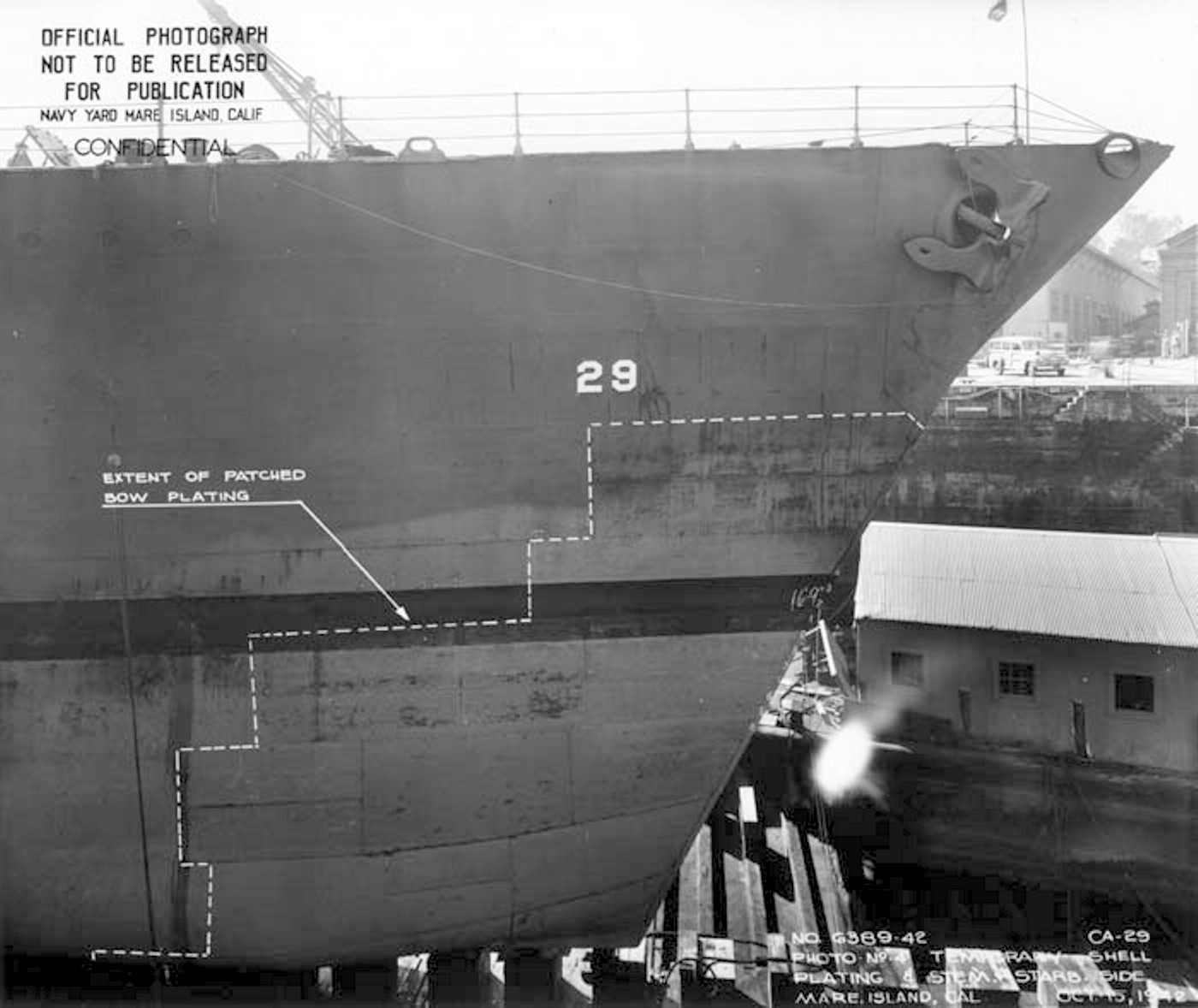 Closeup of fully repaired bow. Dotted line indicates area of the repair. Photo taken 27 November 1942 at Mare Island. National Archives, San Francisco Branch, Mare Island Naval Shipyard General Correspondence files, 1941-47 |