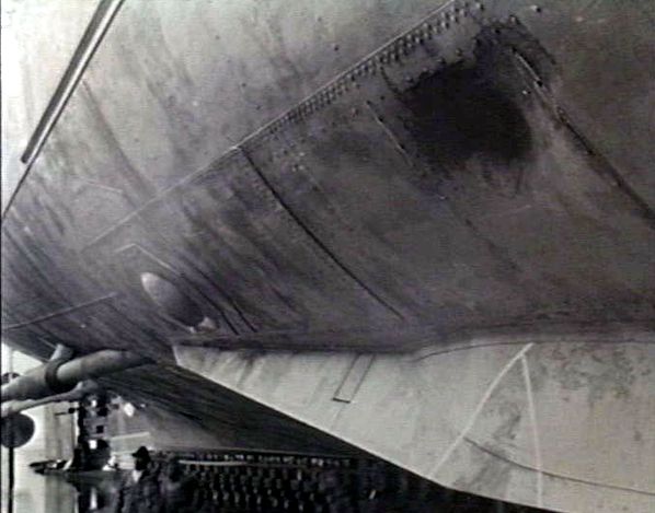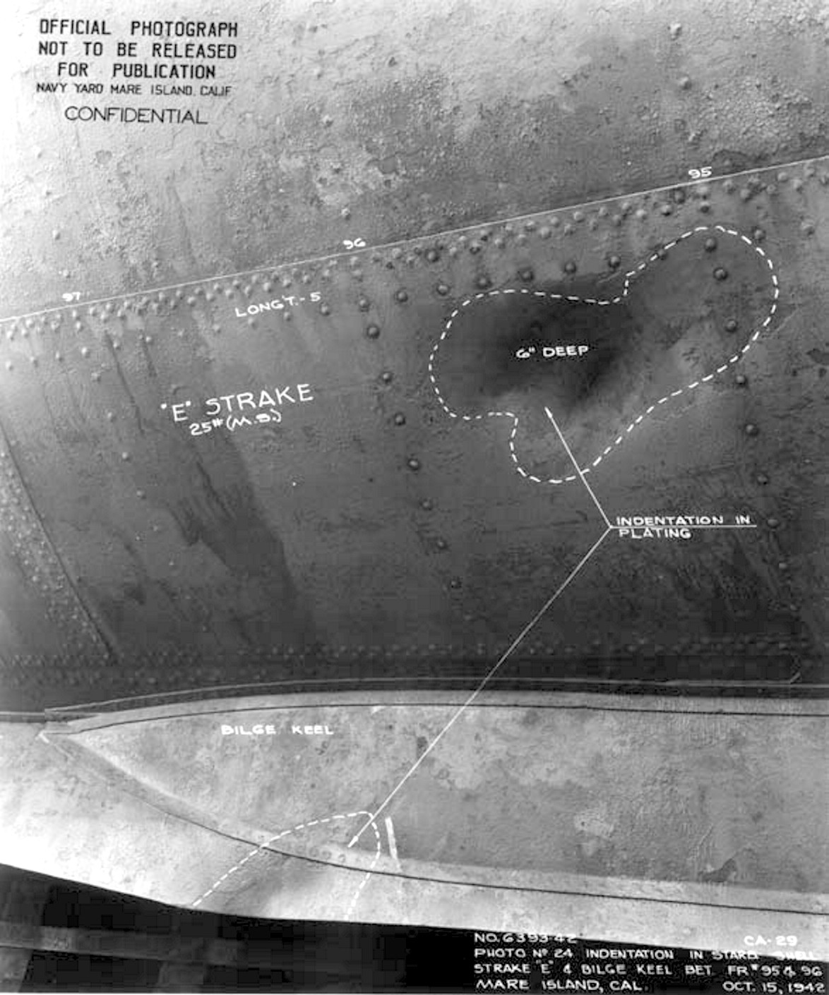 Text from a report concerning the analysis of the dents seen in this photo taken 15 October 1942 at Mare Island: "Upon drydocking it was found that what is believed to have been a torpedo struck the ship, without exploding, between frames 95 and 96 on the starboard, side, at about nine feet above the base line. No penetration of the plating occurred and no damage resulted except oil weeps around rivet heads which have been caulked. From a study of the mark left on the ship as a result of this hit mad as indicated by the photograph it appears that the torpedo hit with a glancing blow from a sharp angle on the bow and was deflected downward at an angle of about 45°, the after body slightly denting the plating at frame 95. The head then appears to have struck the edge of the bilge keel at frame 96-1/2 throwing the tail vane in close to where the head originally hit. There are two well defined adjacent indentations at this point, the larger being 6" deep, the smaller 4" deep. /" National Archives, San Francisco Branch, Mare Island Naval Shipyard General Correspondence files, 1941-47 |