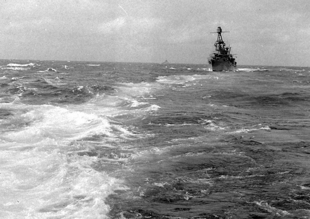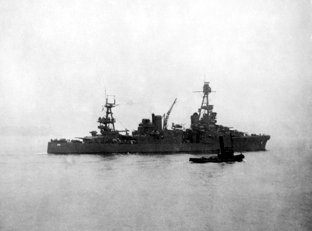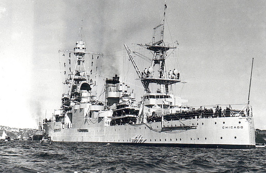 64k | USS Chicago (CA 29) returning to Sydney, NSW, Australia for battle damage repair suffered on August 8-9, 1942 during the Battle of Savo Island. Bow torpedo damage is clearly seen here.