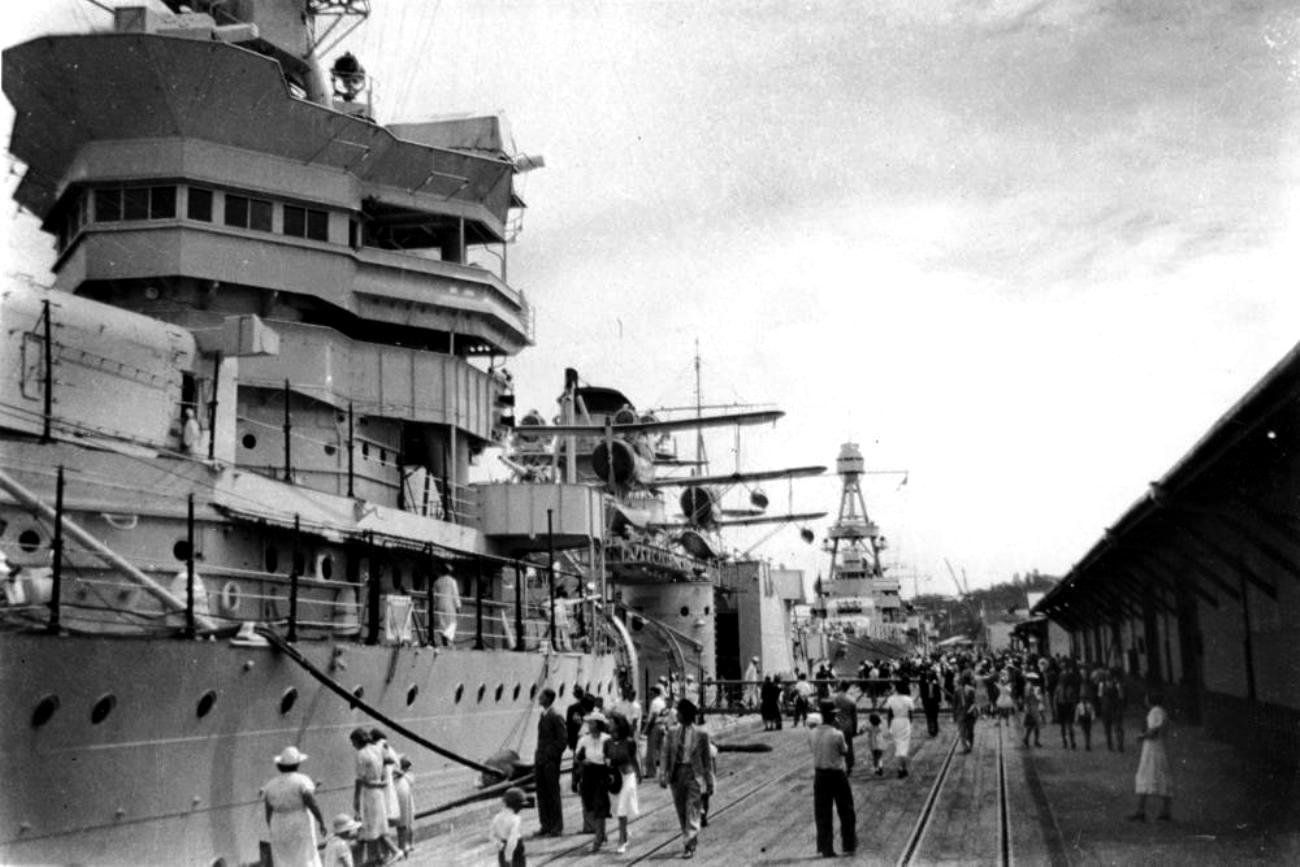 129k | USS Portland, docked at the South Brisbane wharves, while on a goodwill visit to Brisbane by the U.S. Navy, 25 March 1941. This was the first visit of an American Naval Squadron to Brisbane during World War II . This was prior to the Japanese attack of Pearl Harbor in December 1941. Chicago is moored astern of USS Portland. The squadron was made up of the cruisers USS Chicago, flying the flag of Rear Admiral John H. Newton, and USS Portland, escorted by destroyers Clark, Conyngham, Reid, Cassin and Downes. The ships had arrived from Sydney, having also visited New Zealand. Photo: Queensland Newspapers Collection, John Oxley Library Queensland,