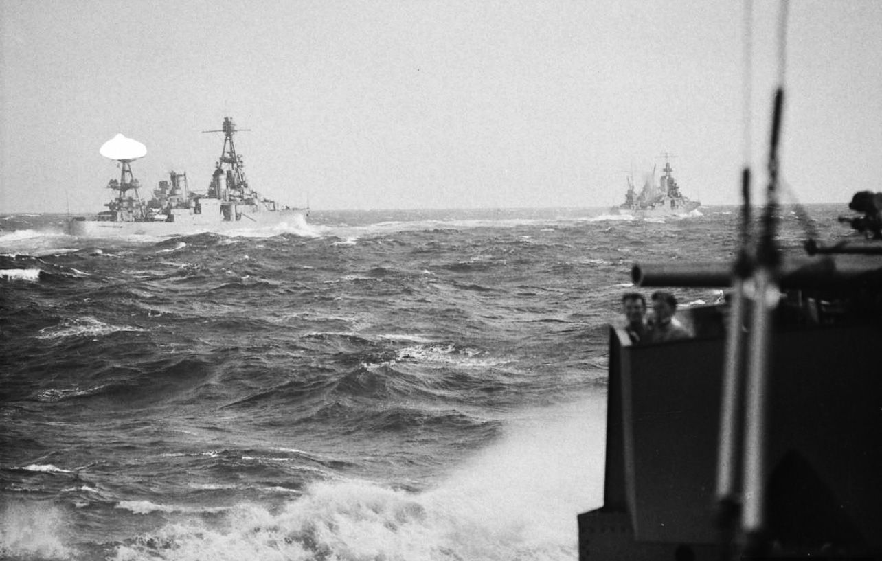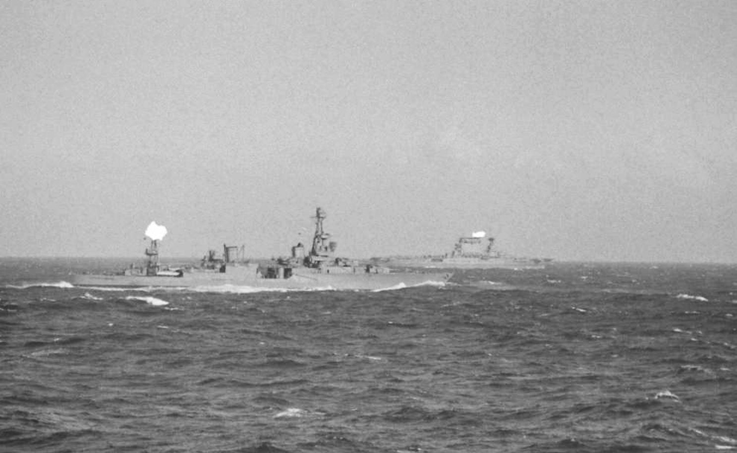 destroyer's stern and wake in the foreground. Column of smoke in the left