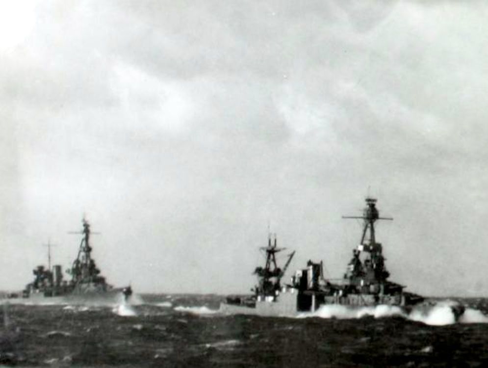 82k | Coral Sea, May, 1942. Led by two United States destroyers, four heavy cruisers of Task Force 44 steam in line ahead formation. The cruisers are (L to R) are USS Salt Lake City (CA 25), USS Chicago (CA 29), HMAS Canberra (D 33) and HMAS Australia (D 84). Note the gunnery radar at the peak of the foremast of the two US cruisers. The task force was created on 22 April 1942 from the ANZAC Squadron as part of the South West Pacific Area and comprised RAN and USN warships. Australian War Memorial Collection, Photo #P02497.005 |