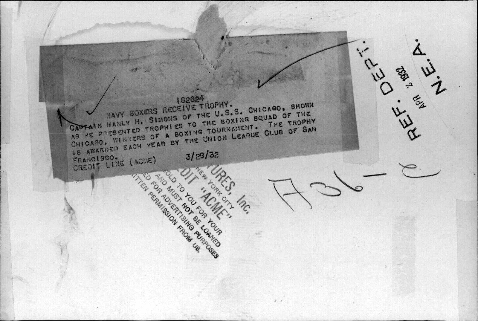 Caption from photo: NAVY BOXERS RECEIVE TROPHY. Captain Manly H. Simons of the U.S.S. Chicago, shown as he presented trophies to the boxing squad of the Chicago, winners of a boxing tournament. The Trophy is awarded each year by the Union League Club of San Francisco. CREDIT LINE (ACME) 3/29/32 | David Wright | |