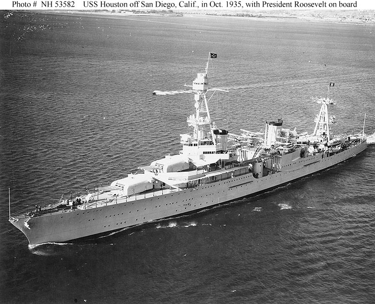 Houston (CA 30) off San Diego, California, in October 1935, with President Franklin D. Roosevelt on board. She is flying an admiral's four-star flag at her foremast peak, and the Presidential flag at her mainmast peak. U.S. Naval Historical Center Photograph. |