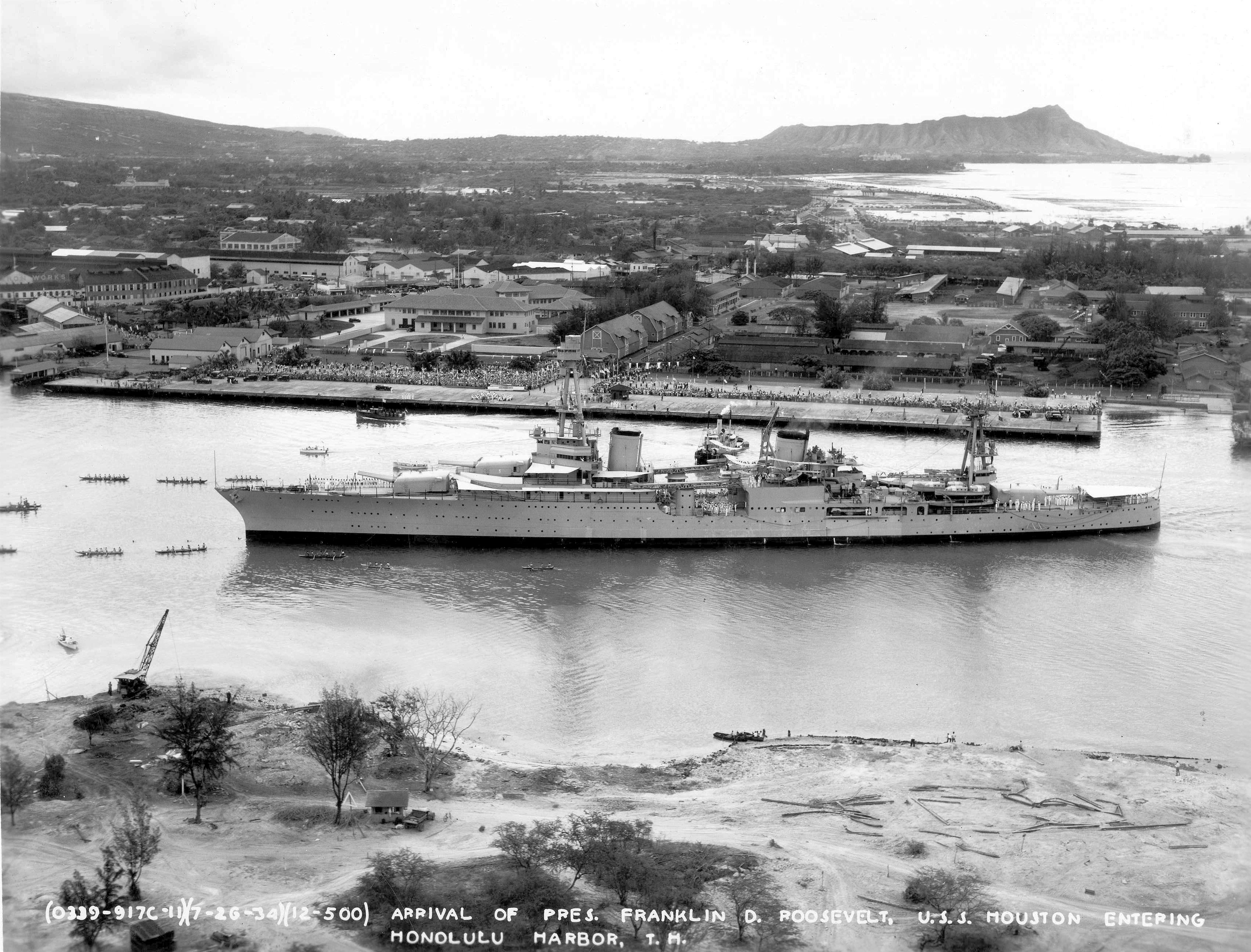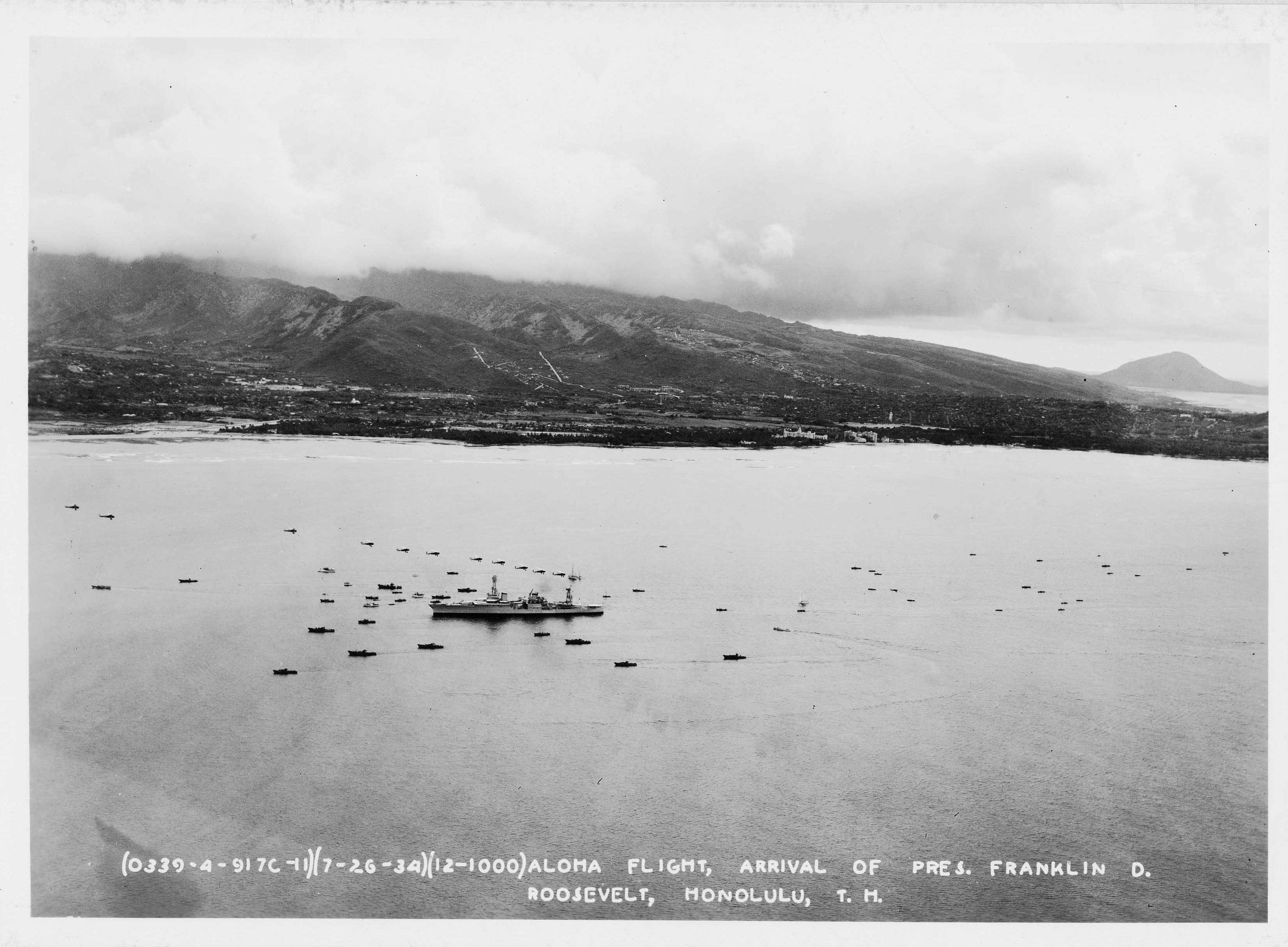 2.80k | Aloha Flight, Arrivial of President Franklin D. Roosevelt aboard the Houston (CA 30) in Honolulu. | Record Group 18: Records of the Army Air Forces Series: "Airscapes" of American and Foreign AreasFile Unit: Hawaii - Honolulu National Archives Identifier:23939161 Photo courtesy of catalog.archives.gov | |
