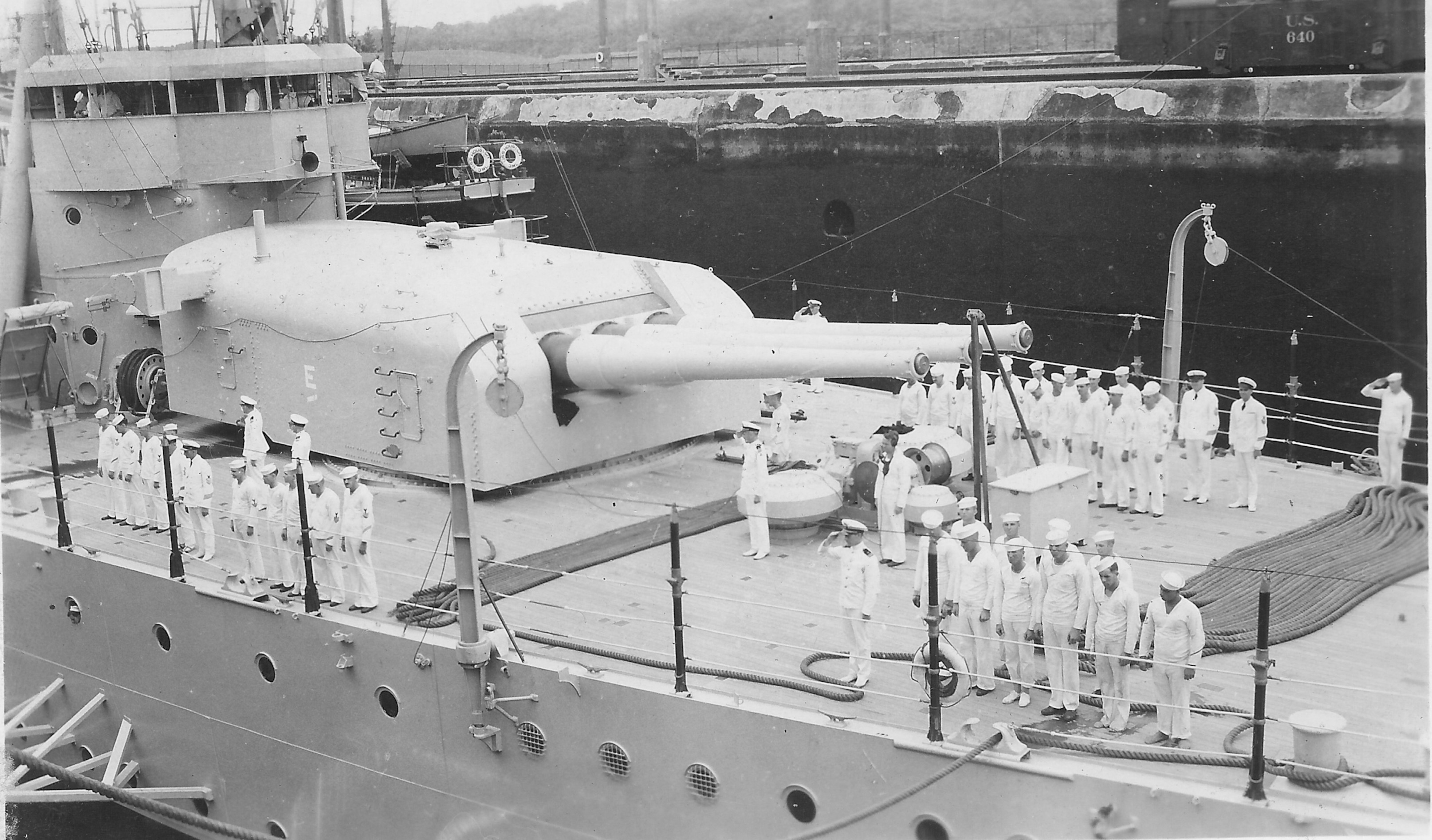 1.66k | Crew near the rear turret standing at attention when they passed the national colors | Photo courtesy of Jason Longo via an album from an Army Coast Artilleryman who was stationed at the Panama Canal from 1934-1937. He was stationed near the Gatun Locks, on the Atlantic side. | |