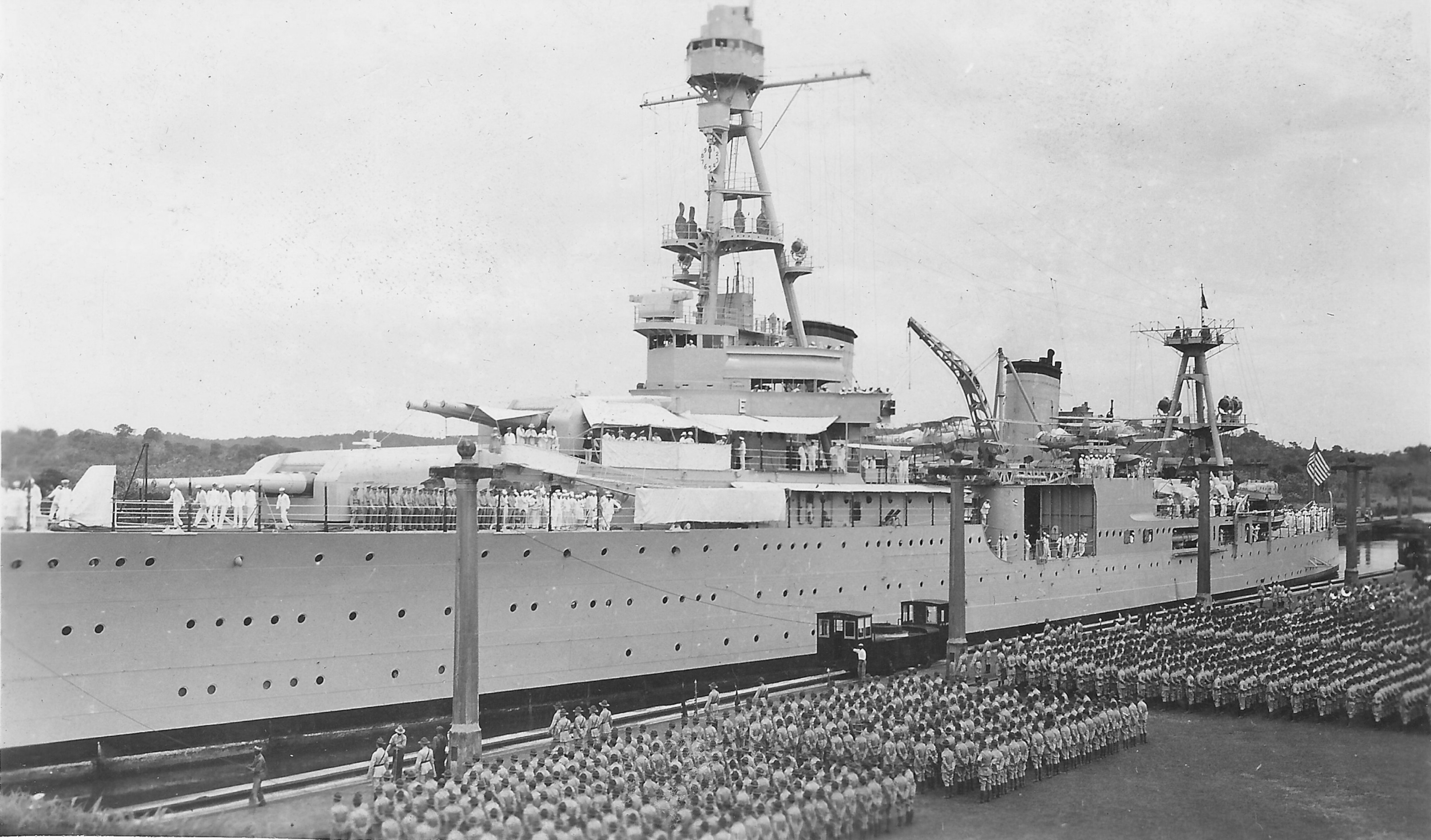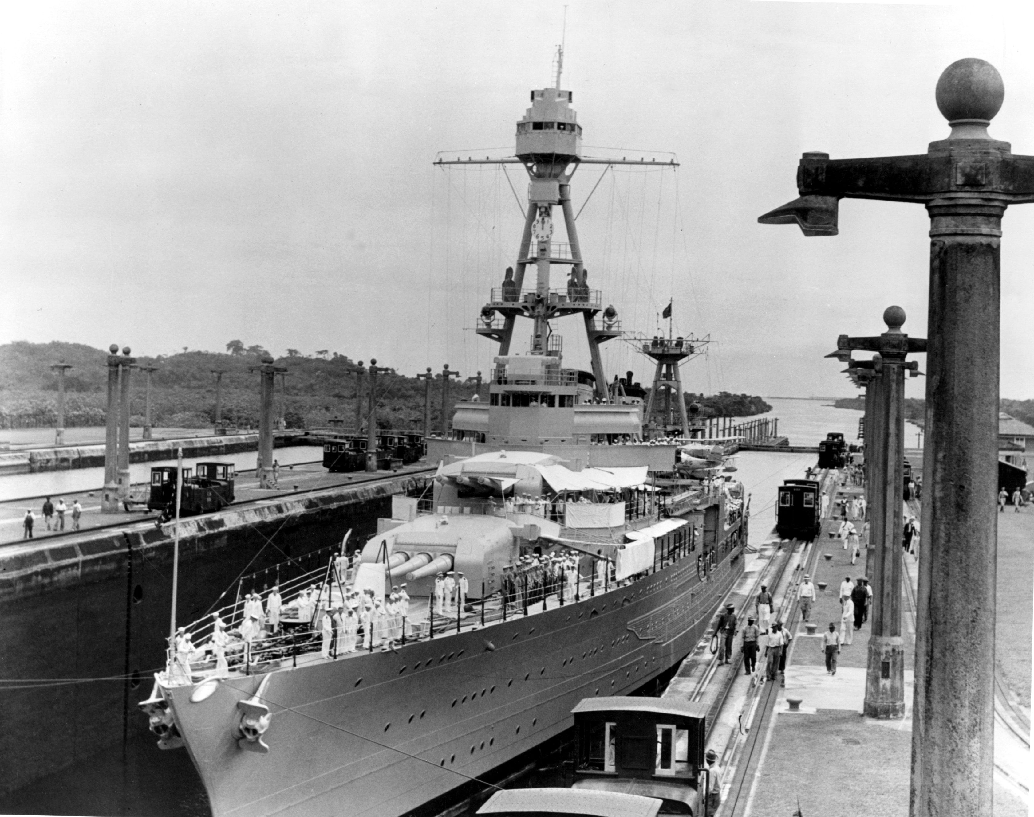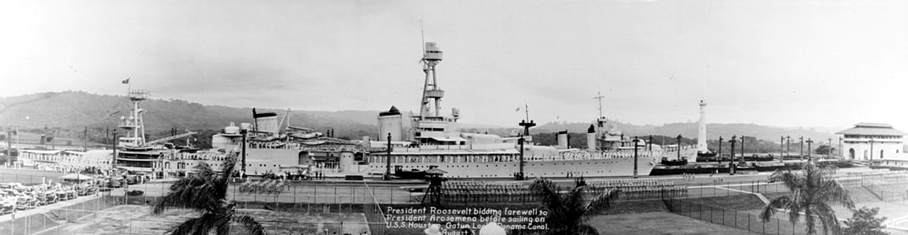 USS Houston (CA 30) transits the Panama Canal with Franklin Delano Roosevelt's presidential party on 11 July 1934 en route from Annapolis, Maryland to Portland, Oregon. This was the first passage through the canal by a president of the United States while in office. U.S. Navy photo. This Image was released by the United States Navy with the ID 140609-N-ZZ999-004 |