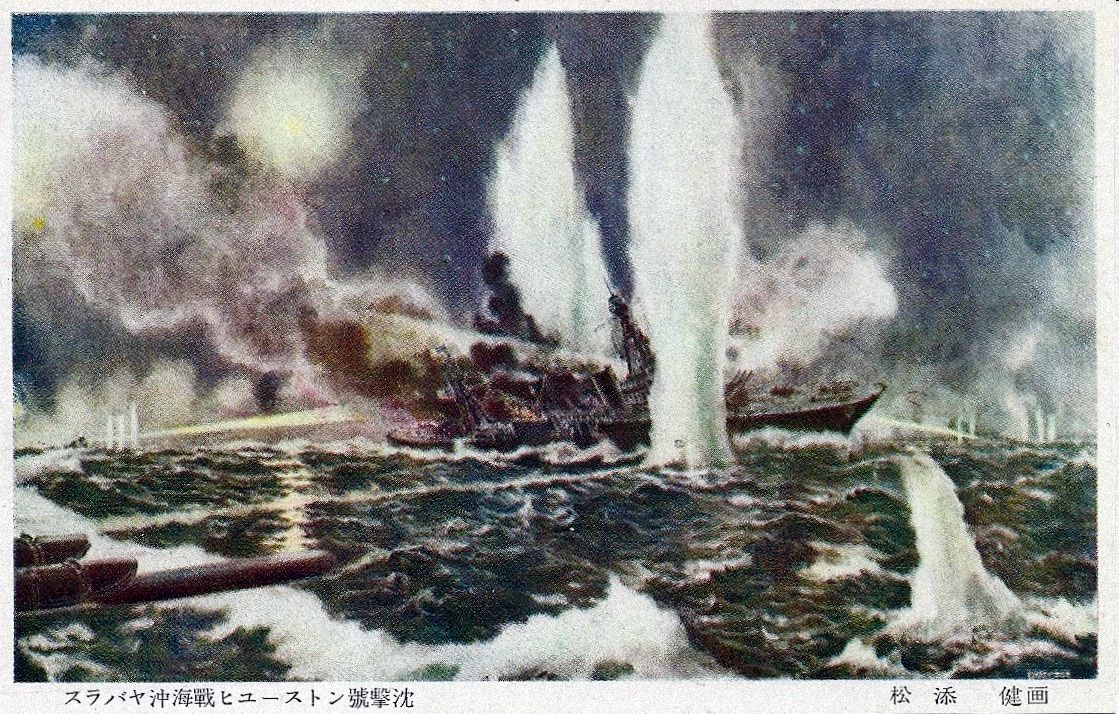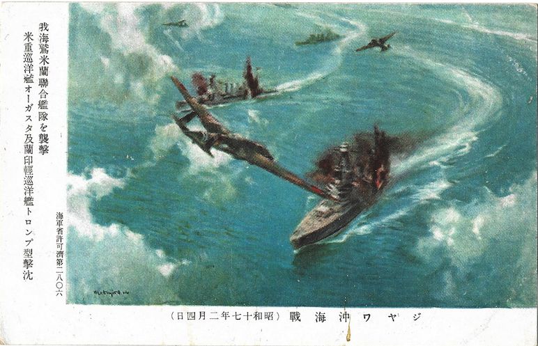 97k | Wartime Japanese propaganda postcard showing the bombing of Houston (CA 30) and Marblehead (CL 12), 4 February 1942, only ID'd as an Augusta-class and Tromp-class cruiser. | Don Kehn | |
