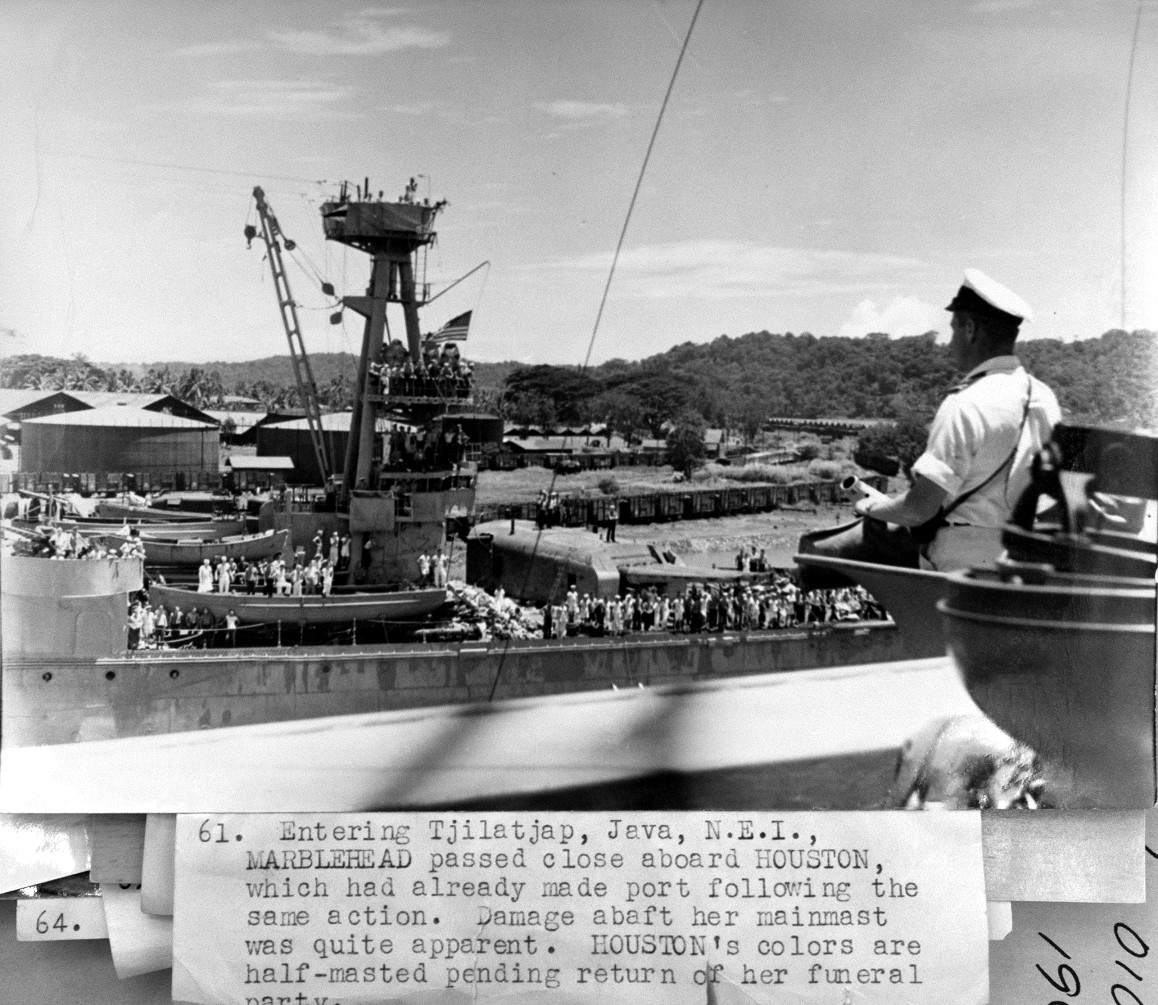 "HOUSTON (CA 30) at Tjilatjap, Java, February 1942, as seen from USS MARBLEHEAD (CL 12). The damage to HOUSTON's aft gunhouse may not appear dramatic, but almost six dozen men were killed & wounded. The armored cover to her turret rangefinder has been blown off in the blast along with the outer doors. Outlines of life-rafts that were destroyed are evident in the paint atop the turret. Over 200 small fragments perforated the side of the gunhouse itself, which led to the fires which gutted the interior and killed most of the turret's gun crew. The turret was already trained out at 30 degrees when the bomb struck, and the damage froze it temporarily in that position." NARA II photo from Marblehead's Action Reports |