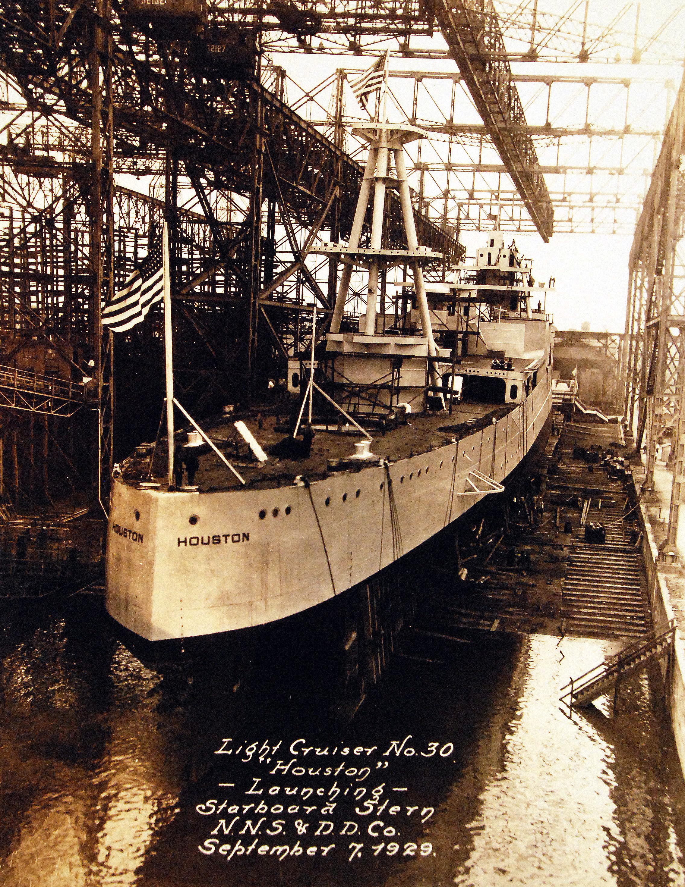 2m | Houston (CL 30) being launched at Newport News Shipbuilding and Dry Dock Company, Newport News, Virginia, on 7 September 1929. | Michael Mohl | |
