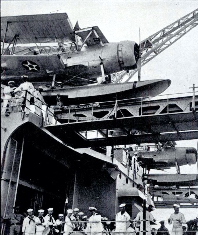 USS Jason is off in the left distance as a Vought O2U-3 or O2U-4 Corsair float plane of Scouting Squadron Eleven is catapulted from USS Houston (CA 30), in Far Eastern waters, circa 1931-1932. US Navy photo # NH 94188 from the collections of the US Naval History and Heritage Command, collection of Lieutenant Oscar W. Levy, USN (Supply Corps), (Retired). |