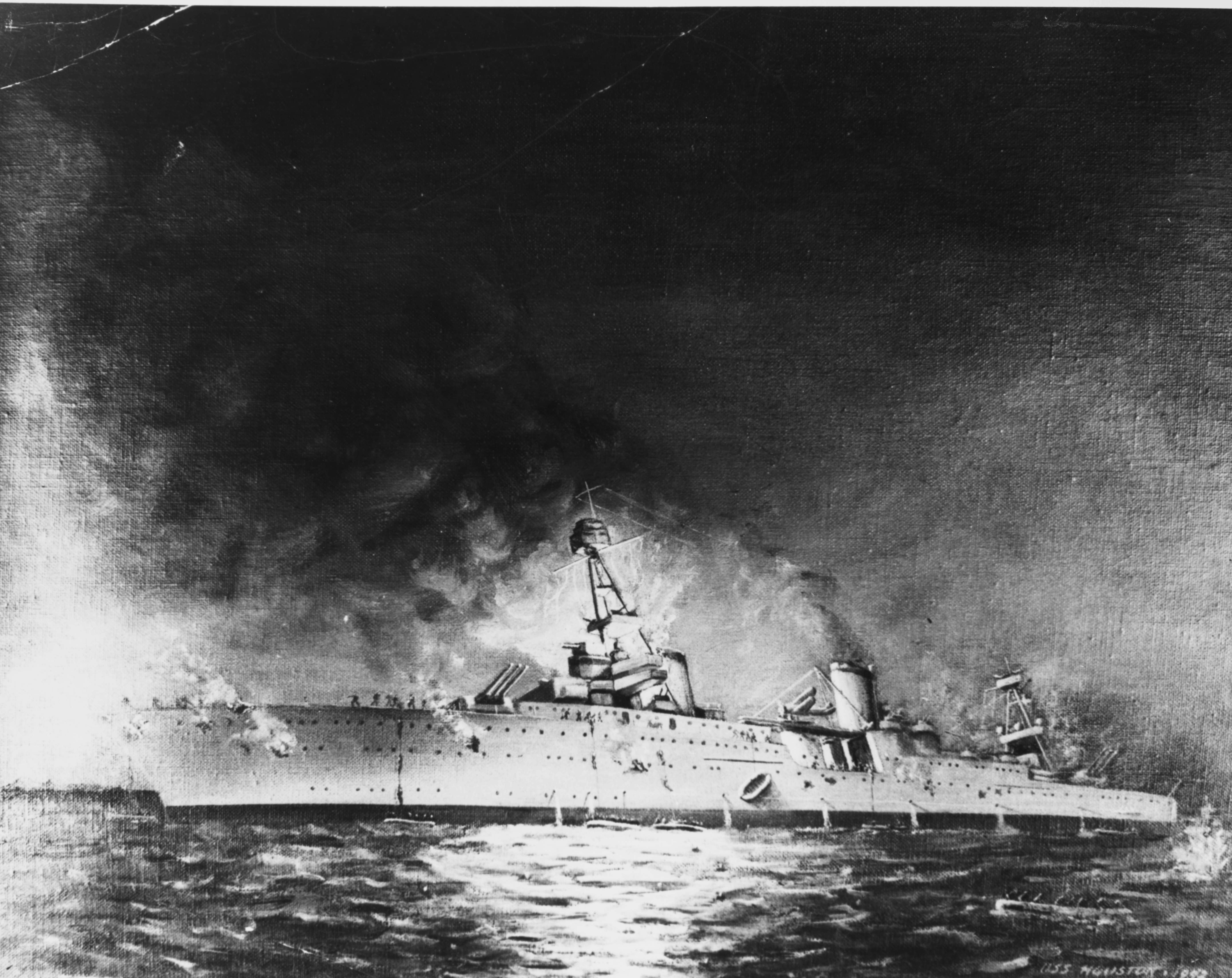1.46k | Painting by Joe T. Fleischman of Houston (CA 30) sinking in the battle of Sunda Strait, 1 March 1942. | Photo NH 93153 courtesy of history.navy.mil | |