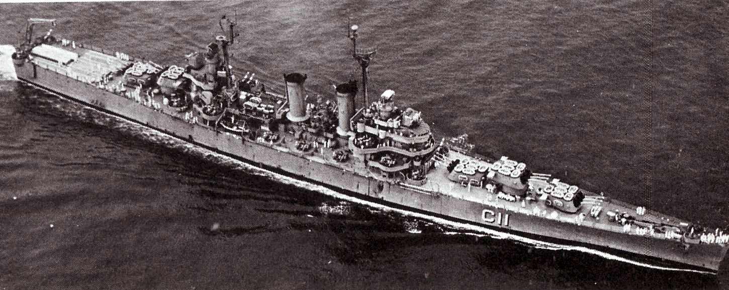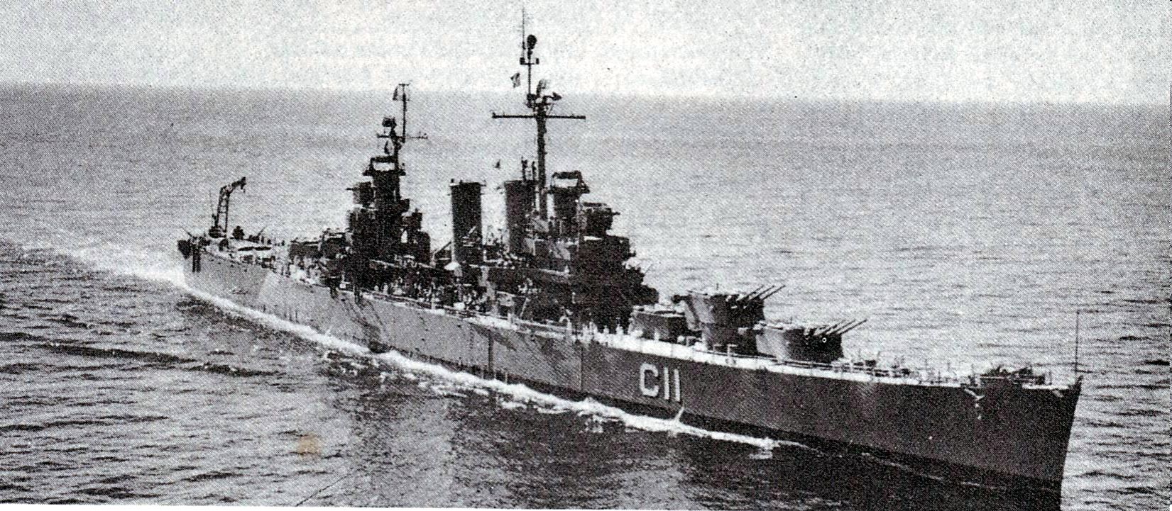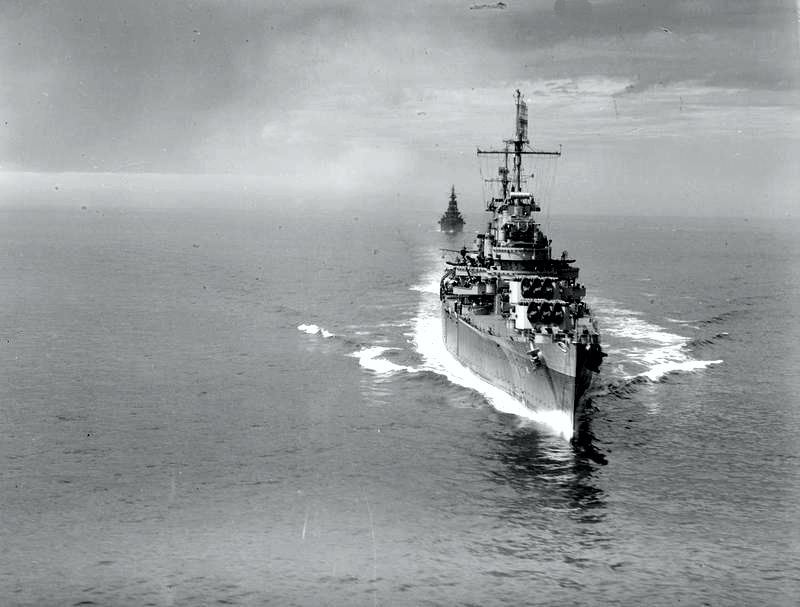 Philadelphia (CL 41) underway on 14 July 1945. The ship is accompanying the USS Augusta (CA 31) carrying President Harry Truman to Antwerp, Belgium. Australian War Memorial, Photo #SUK14507 |
