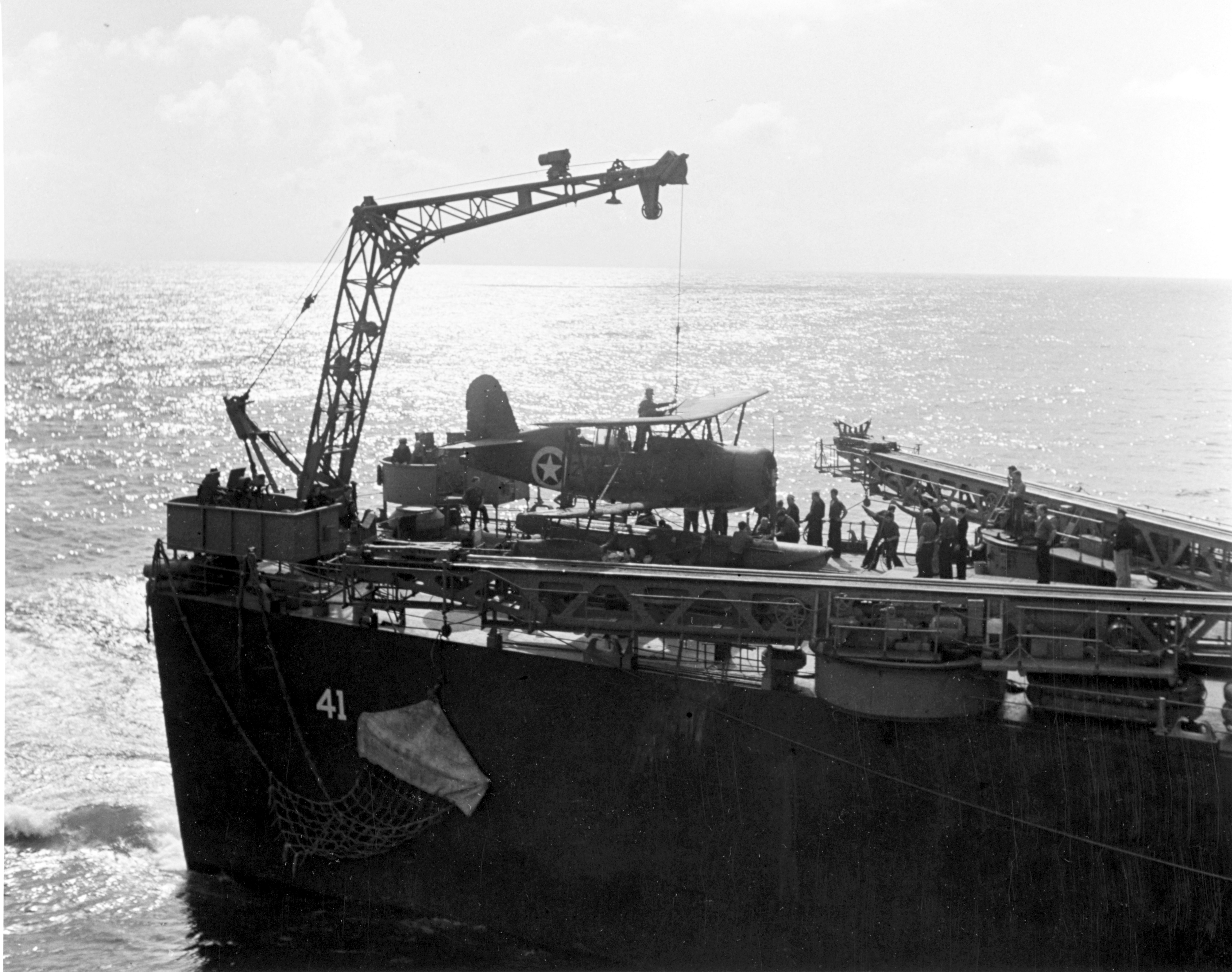 Curtiss SOC "Seagull" scout-observation aircraft is unhooked from the crane after recovery by Philadelphia (CL 41), during the North African operation, November 1942. Photographed by Lieutenant Horace Bristol, USNR. Official U.S. Navy Photograph #80-G-470059, now in the collections of the National Archives. |