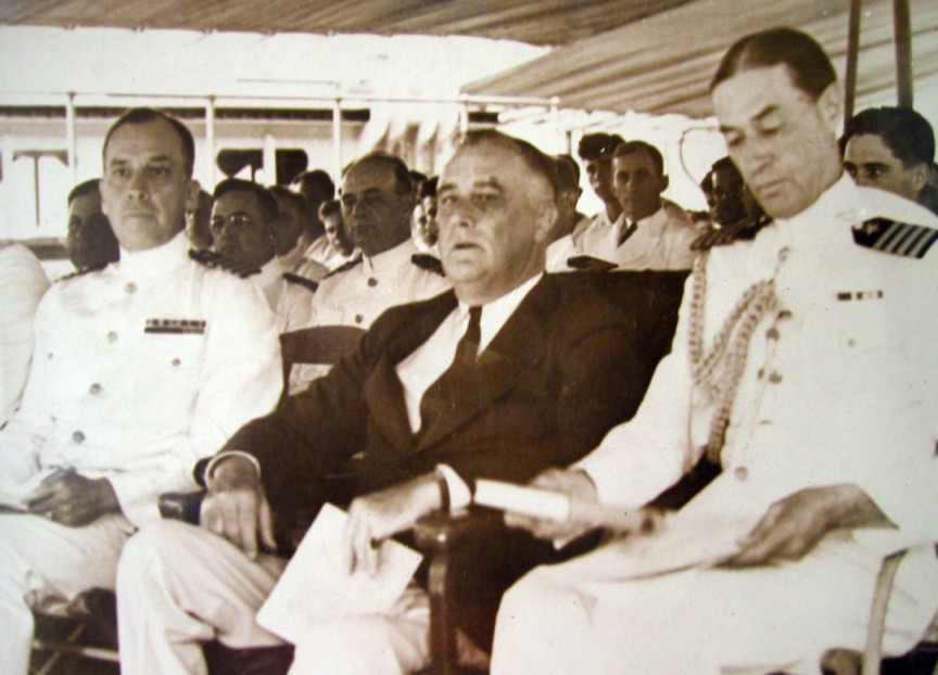 119k | President Roosevelt, CAPT Jules James (left) of the USS Philadelphia, and CAPT W.B. Woodson, Naval Aide to the President, are pictured as they attended Sunday Chapel Service aboard the new cruiser during President Roosevelt's cruise on her in southern waters, May 1938. Courtesy of Jules James. | Robert Hall |