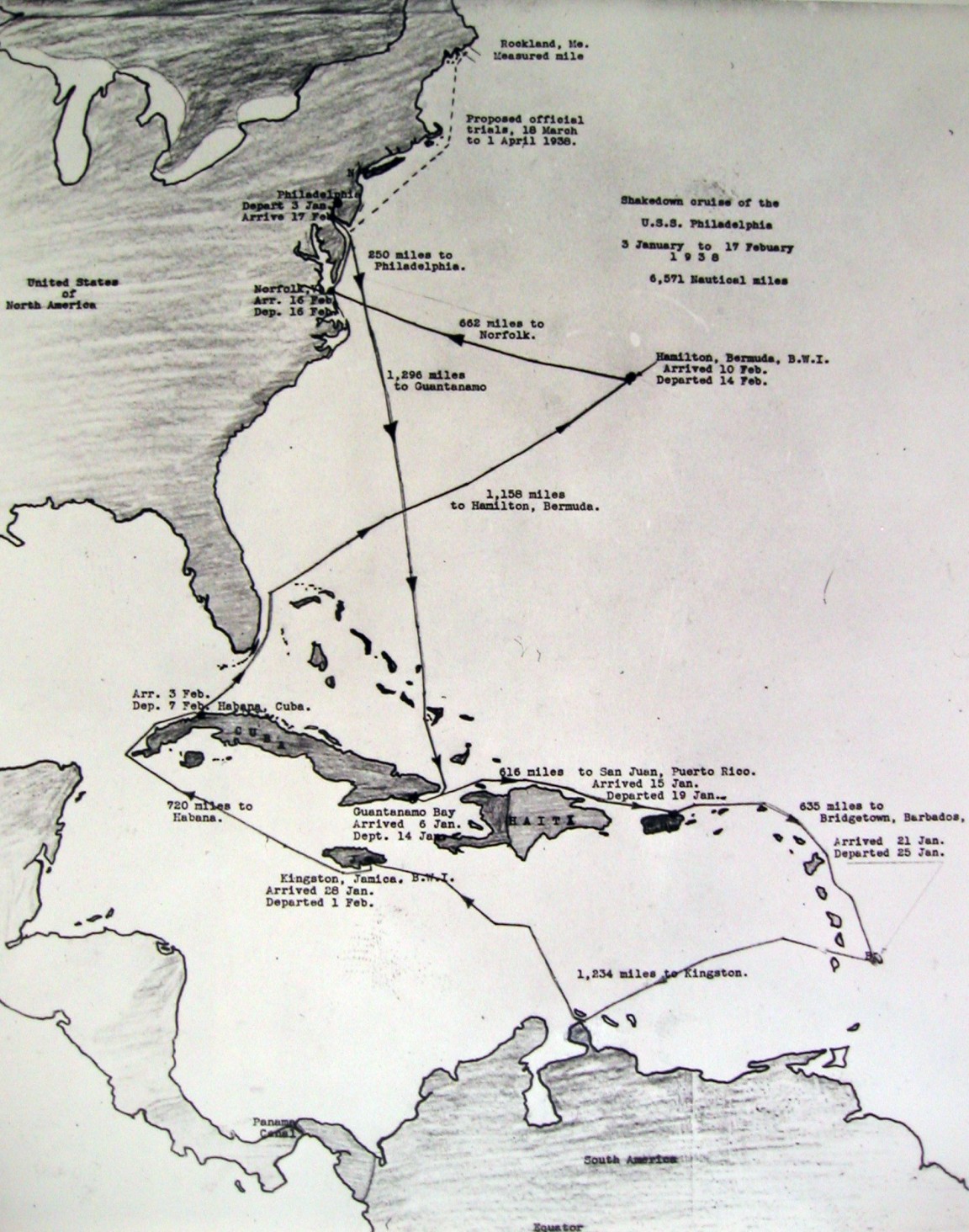 374k | Map of the shakedown cruise of Philadelphia, 1938. Courtesy of Jules James. | Robert Hall |