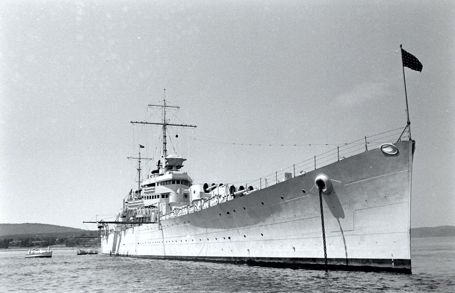 Starboard side close-up view of the Philadelphia (CL 41) anchored off Bar Harbor, Maine in 1938. The cruiser is continuing trials after modifications were completed at the Philadelphia Navy Yard. Life Magazine Archives, Alfred Eisenstaedt photographer. Shared by Peter DeForest. |