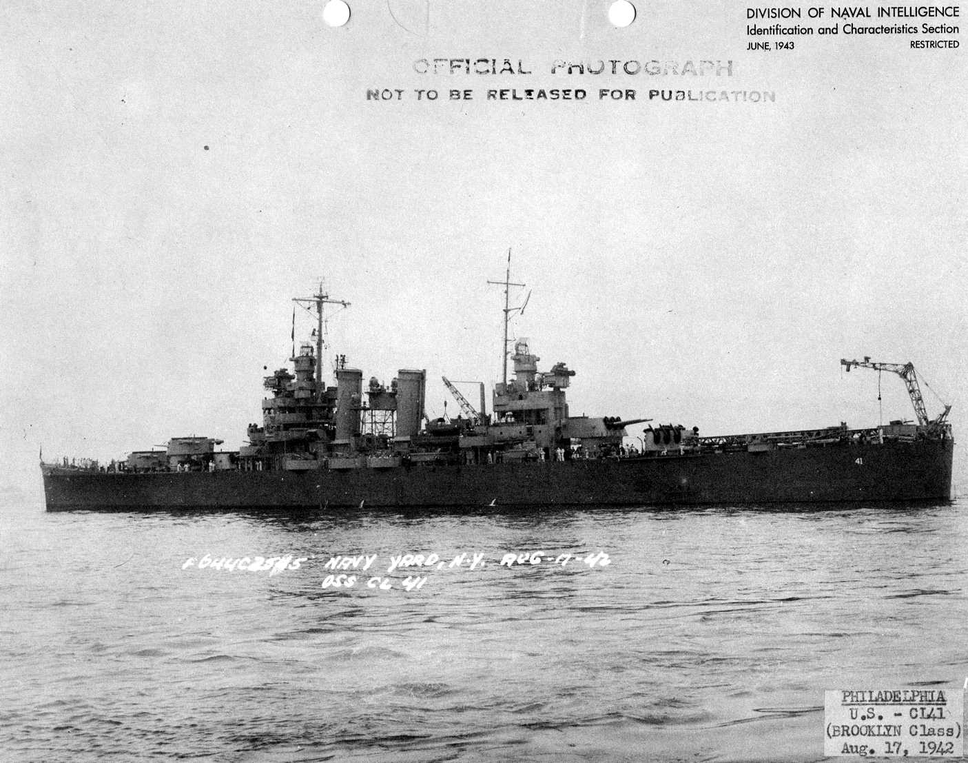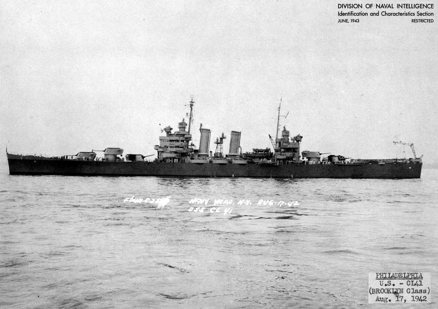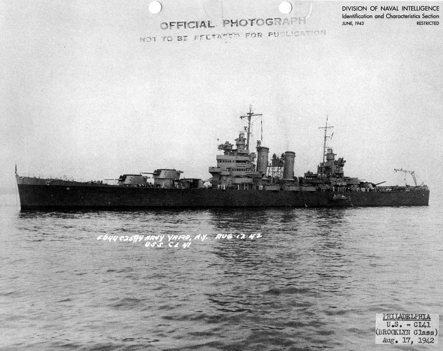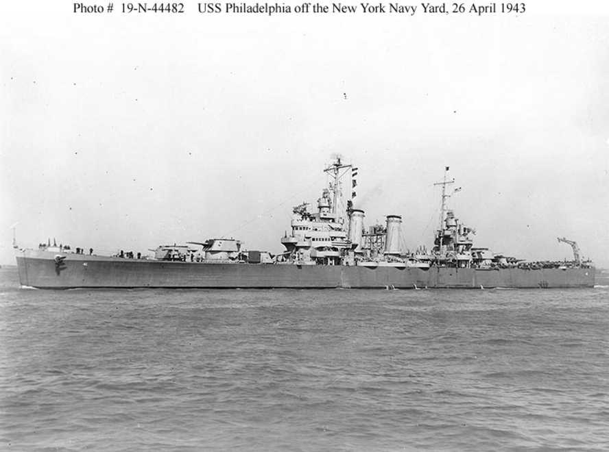 Philadelphia (CL 41) off New York City, 26 April 1943. Official U.S. Navy Photograph, now in the collections of the National Archives - 80-G-63794. |