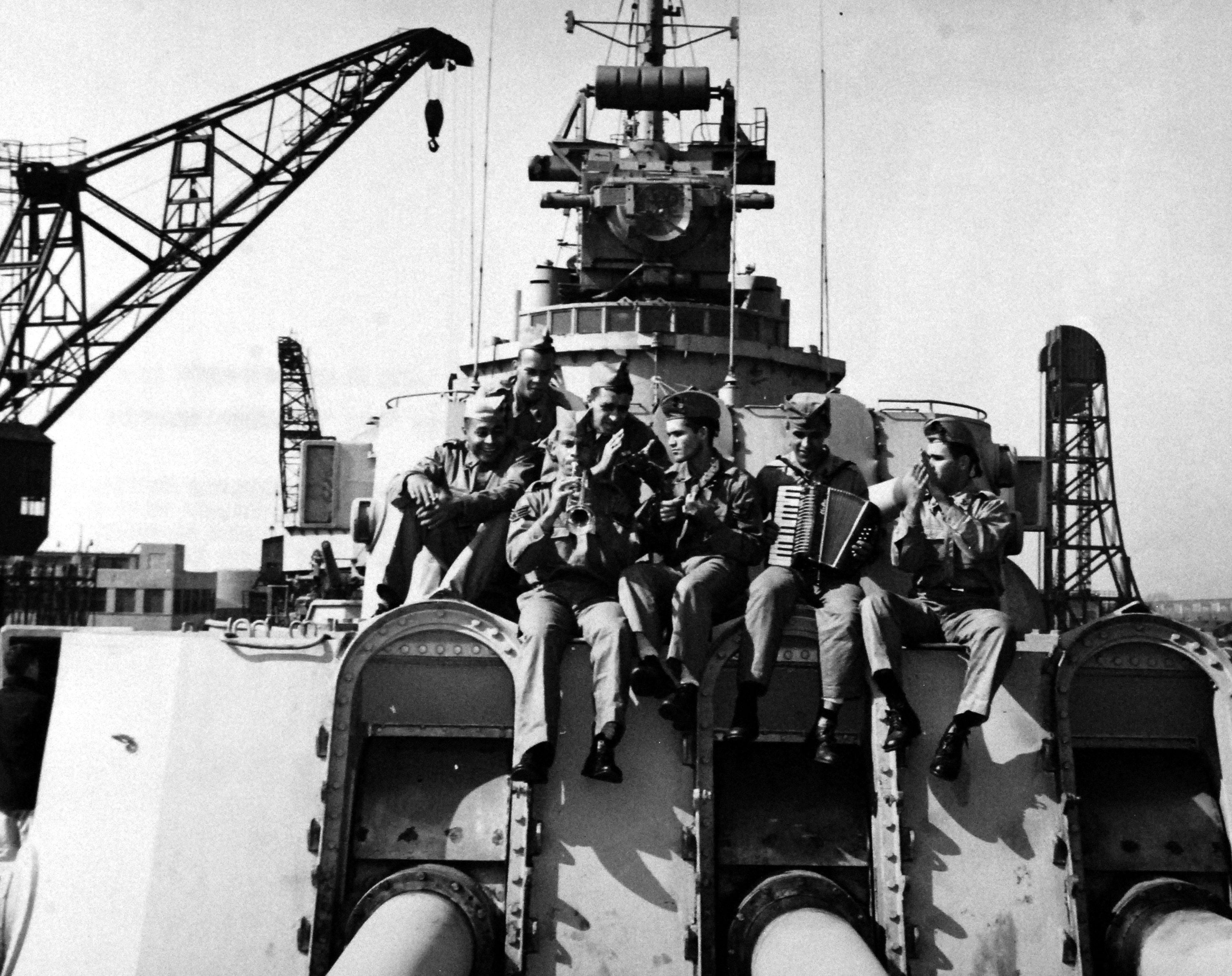 Brazilian Marines hold a band concert on the gun turret of the Almirante Barroso, formerly USS Philadelphia (CL 41), which is being reactivated for the Brazilian Navy under the Mutual Defense Assistance Program at the Philadelphia Naval Base. USN photograph #708171 released 27 March 1951. |