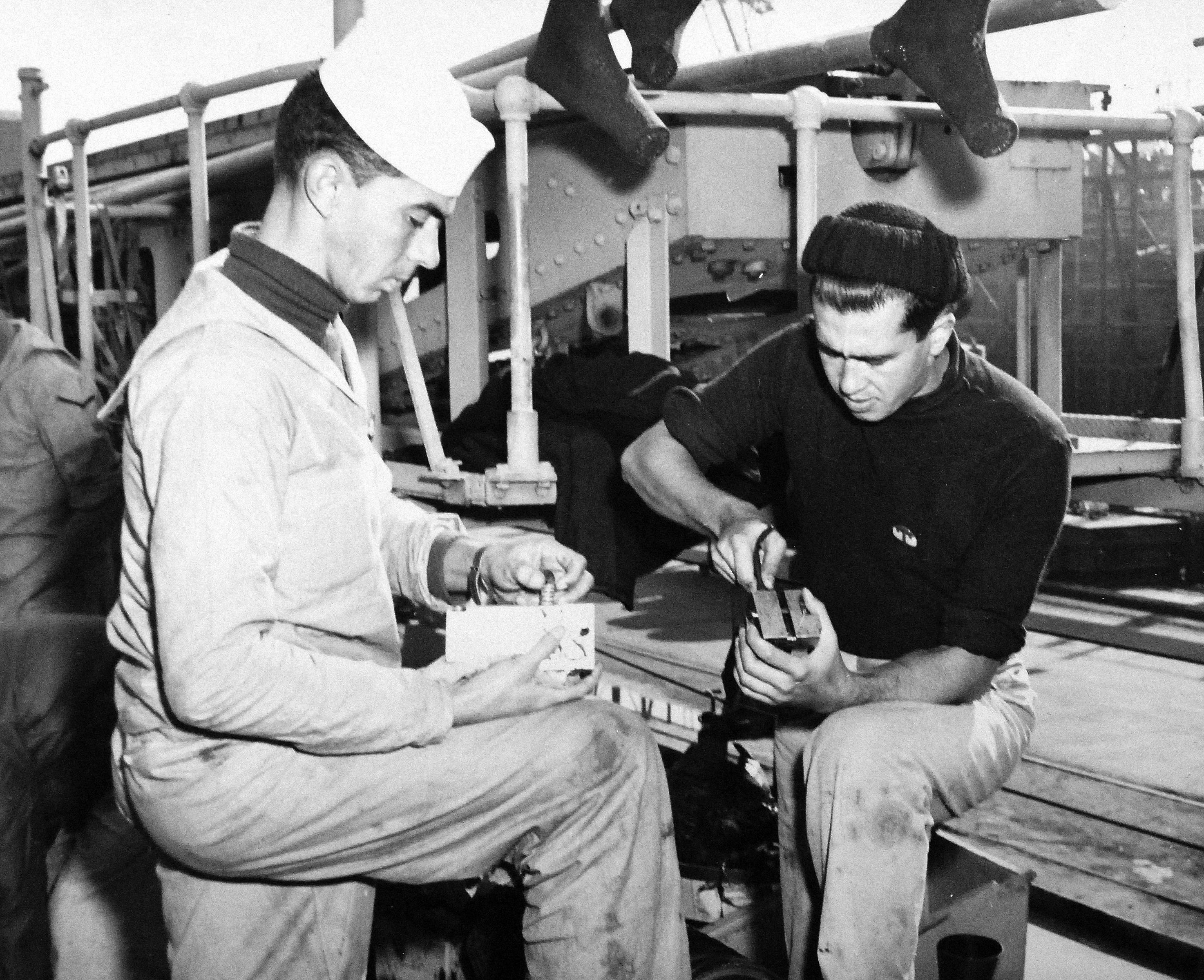 Two Brazilian Seaman, Pedro Pereira de Silvan, and Osni Maia Caldeira Martins, inspect parts of a 40mm gun on the Almirante Barroso, formerly Philadelphia, which is being reactivated for the Brazilian Navy under the Mutual Defense Assistance Program, U. S. Navy Photograph #707172, 27 March 1951. |