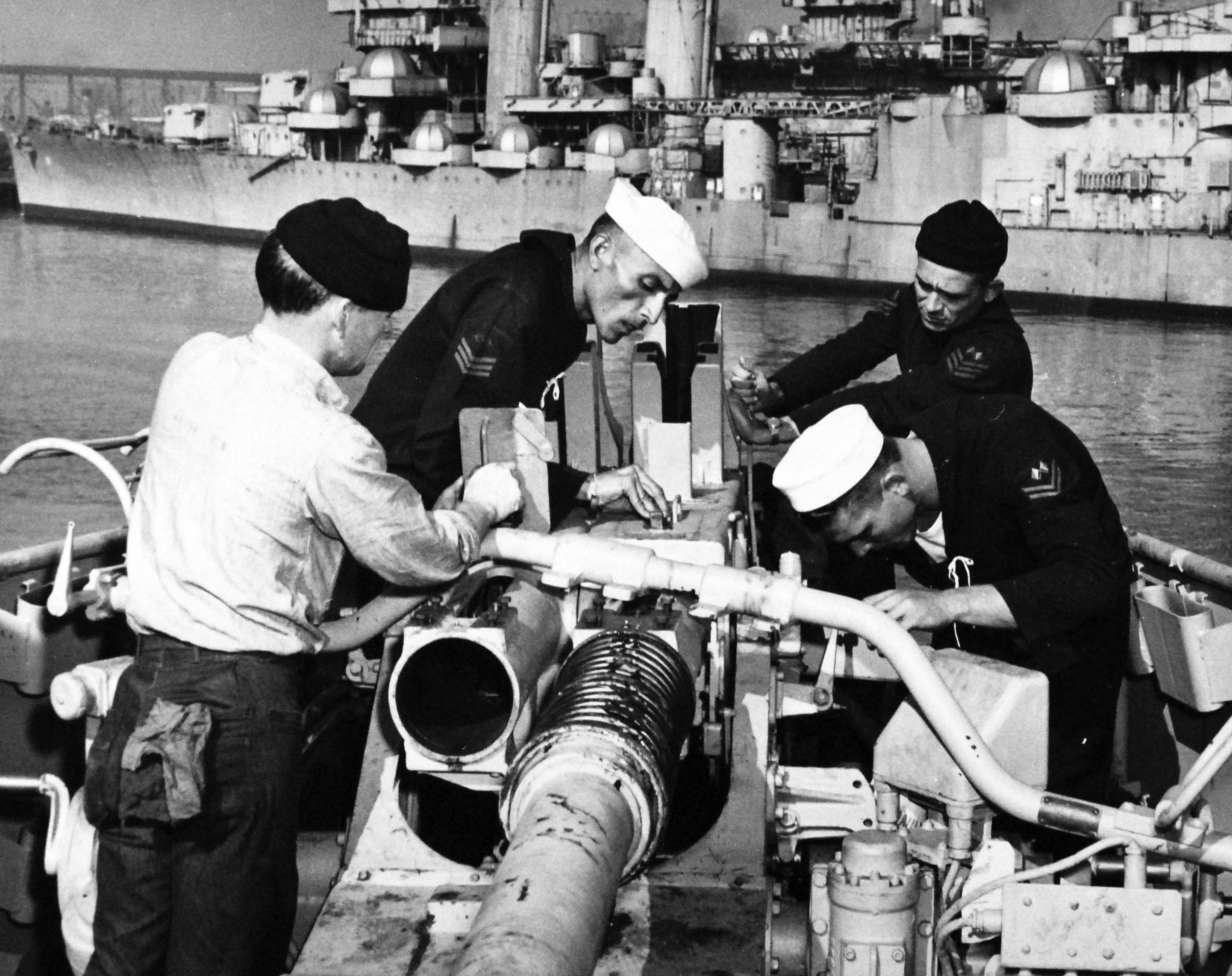 At the Philadelphia Naval Base, an American gunner’s mate watches Brazilian sailors check over one of the anti-aircraft guns on ex-Philadelphia (now Almirante Barroso) being reactivated for the Brazilian Navy under the Mutual Defense Assistance Program. The Brazilians are (second from left to right): Raul Francisco da Cunha; Inanar Medeiros; and Osman Tovares. U. S. Navy photograph #708176, 27 March 1951. |