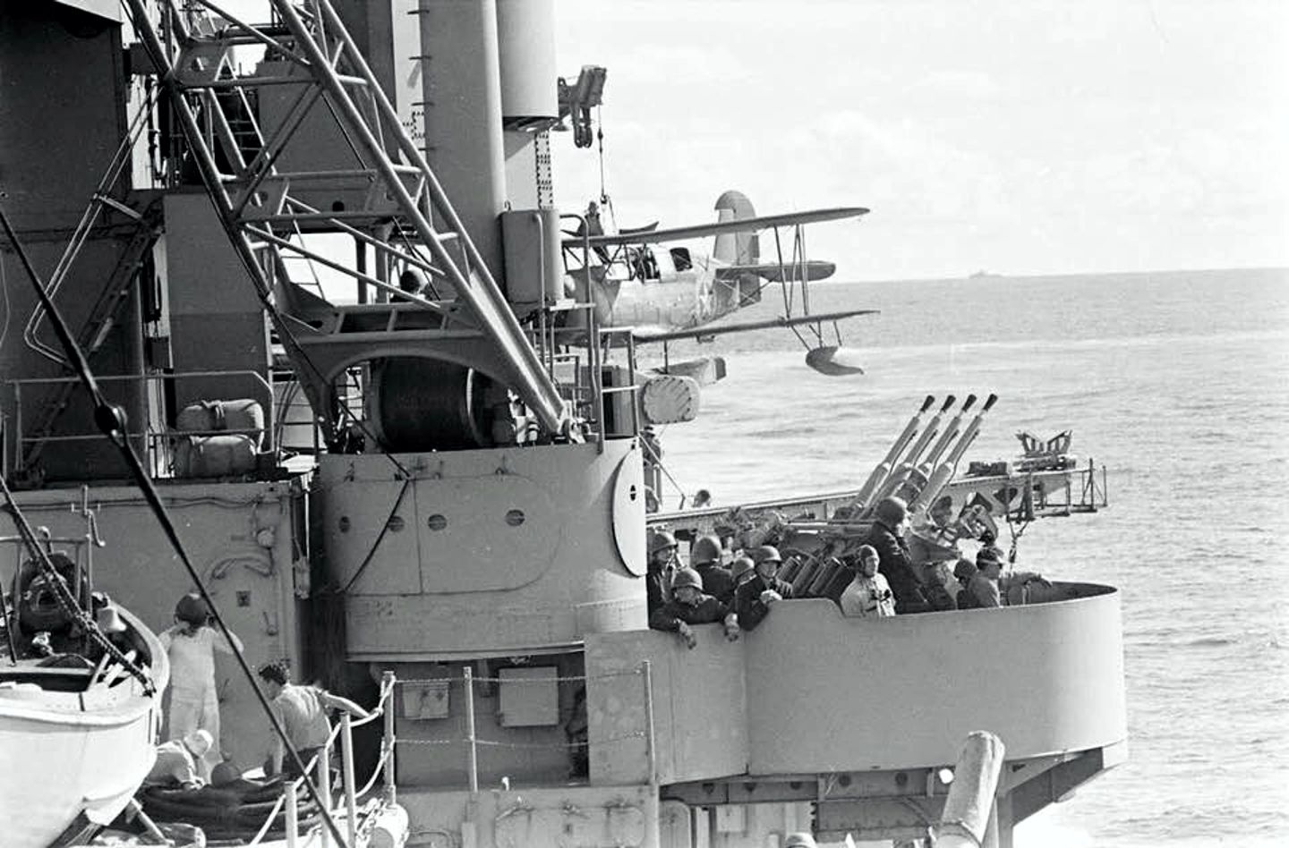 Curtiss SOC "Seagull" scout-observation aircraft is hoisted on board Philadelphia (CL 41), during the North African operation, November 1942. Note crewmen holding lines to steady the plane as the aircraft crane swings it inboard. Photographed by Lieutenant Horace Bristol, USNR. Official U.S. Navy Photograph #80-G-470060, now in the collections of the National Archives |