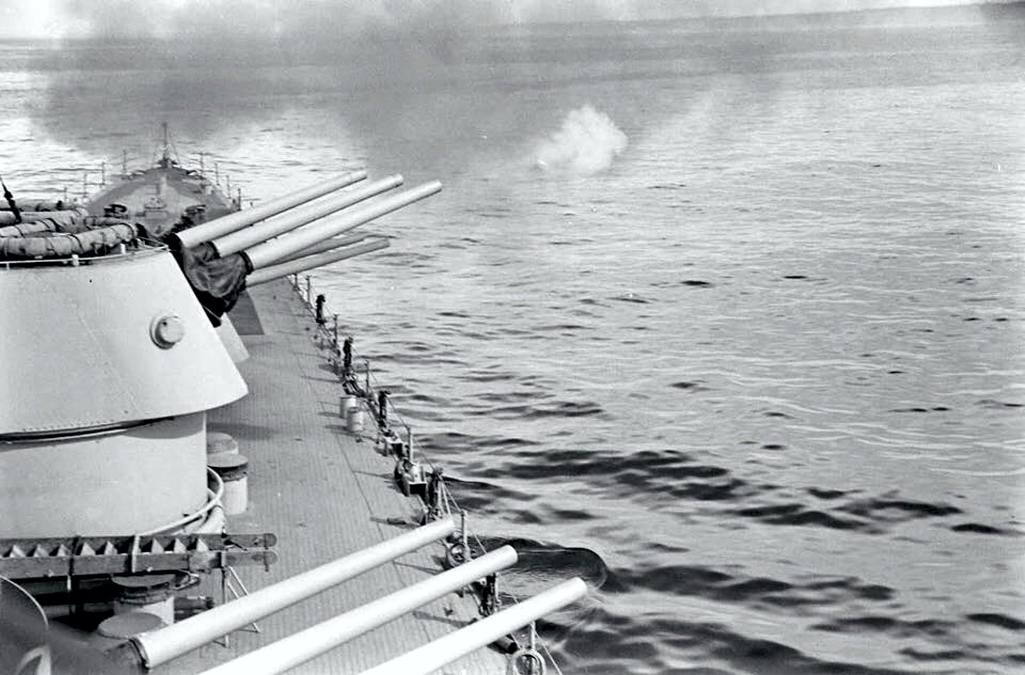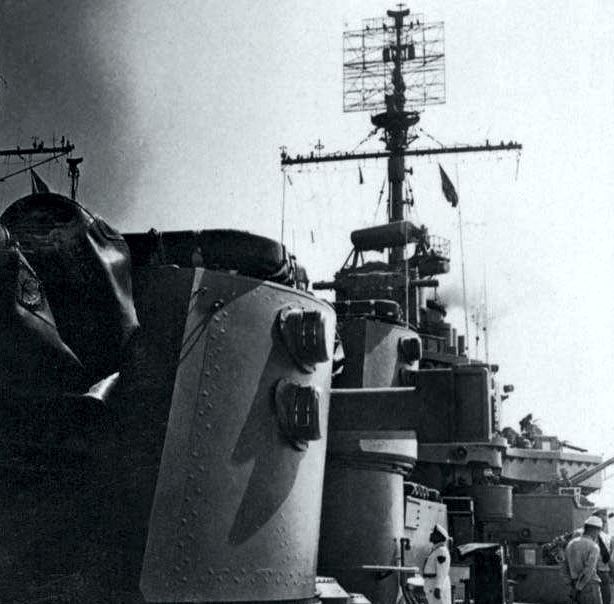 Starboard side looking forward of the Philadelphia (CL 41). Photo was taken during Operation Torch off of Safi Morocco in November 1942 and shows the #1 and #2 forward 6?€¯/47 main gun turrets, trained to starboard. #2 turret guns appear to be at maximum elevation. LIFE Magazine Archives - Eliot Elisofon Photographer, Shared by Peter DeForest |