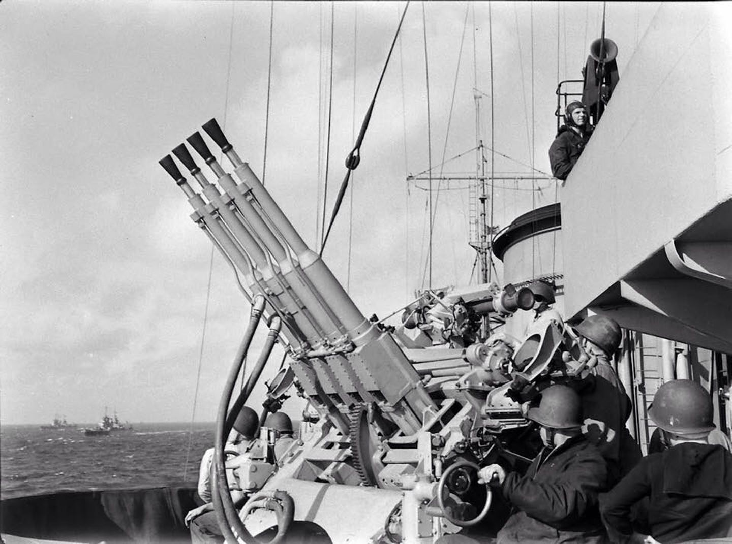 Trained skyward, manned and ready, a starboard quadruple 1.1?€¯/75 mount was guarding the Philadelphia (CL 41). Photo is taken during Operation Torch off of Safi Morocco in November 1942. Photo is looking aft and other task force ships are visible astern. LIFE Magazine Archives - Eliot Elisofon Photographer, Shared by Peter DeForest |